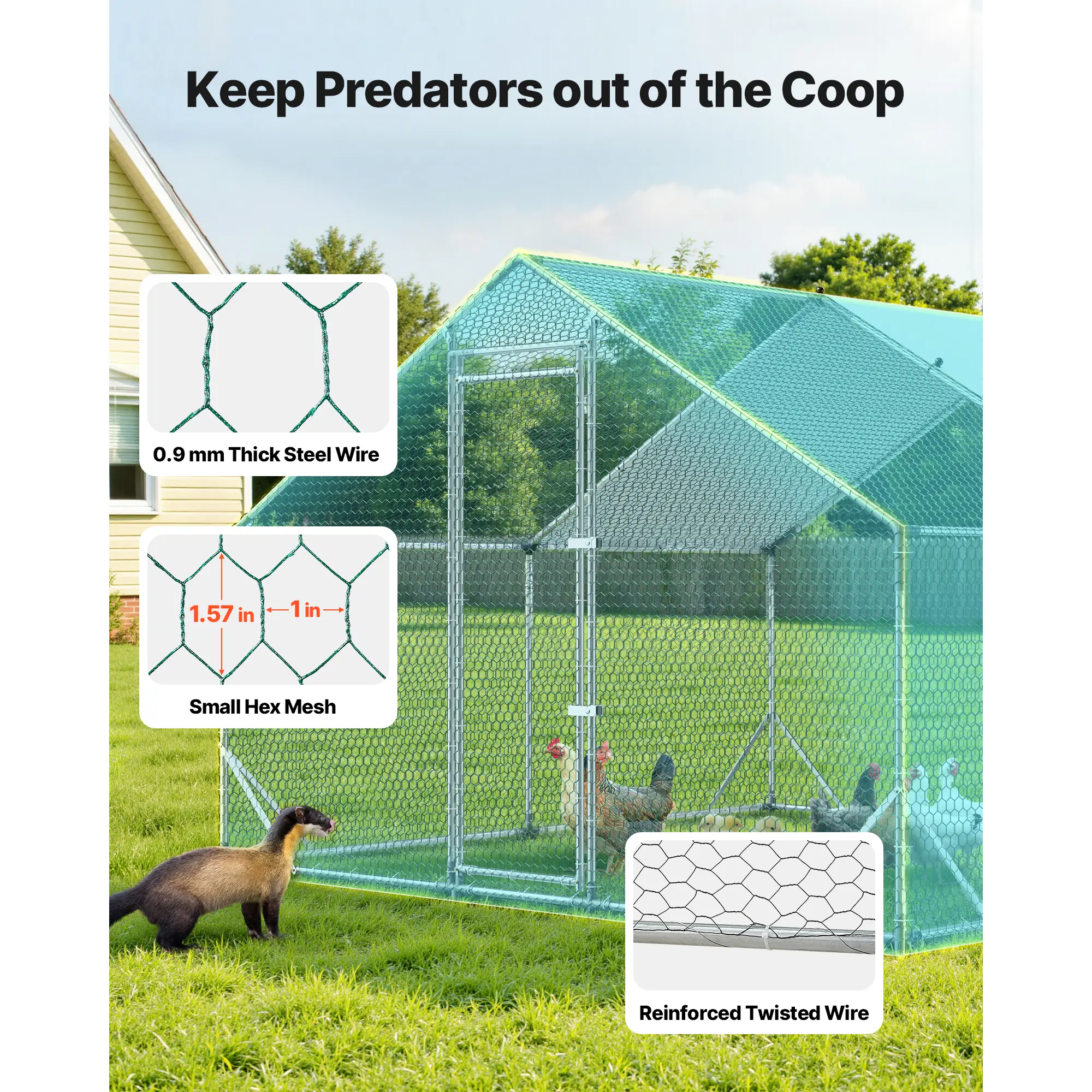 β’ Enhanced Shelter: Our walk-in chicken coop with thick hexagonal wire mesh secured with zip ties prevents poultry escape. Bottom features spiral-wrapped wire and extended door latches to deter predators like raccoons and foxes from breaking in