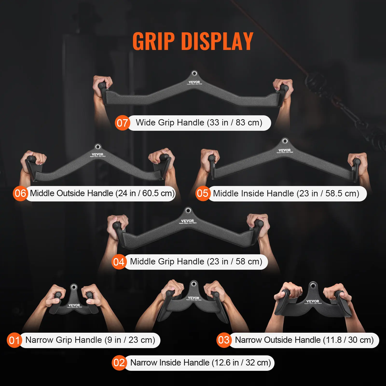 • Pull-Down Attachment Set: Our cable machine attachment set has 7 models, No. 1, 2, and 3 are narrow range handles, mainly training the trapezius and rhomboids. No. 4, 5, and 6 are medium-range handles, and No. 7 is a wide-range handle that mainly exercises the teres major, teres minor, and latissimus dorsi muscles. Meets your needs at home or in the gym and easily connects to any cable machine.