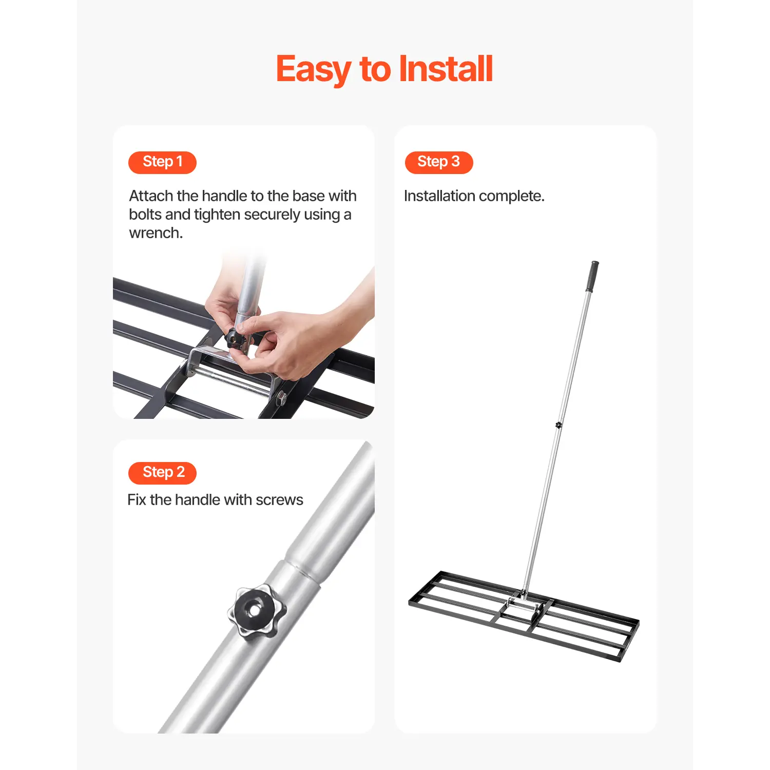• Easy to Assemble: The package includes instruction manual, gloves and installation wrench tool, that allows you to quickly assemble and disassemble the leveling rake. Just connect the base and plate with bolts, using wrench to tighten. It is simple and effortless to install.