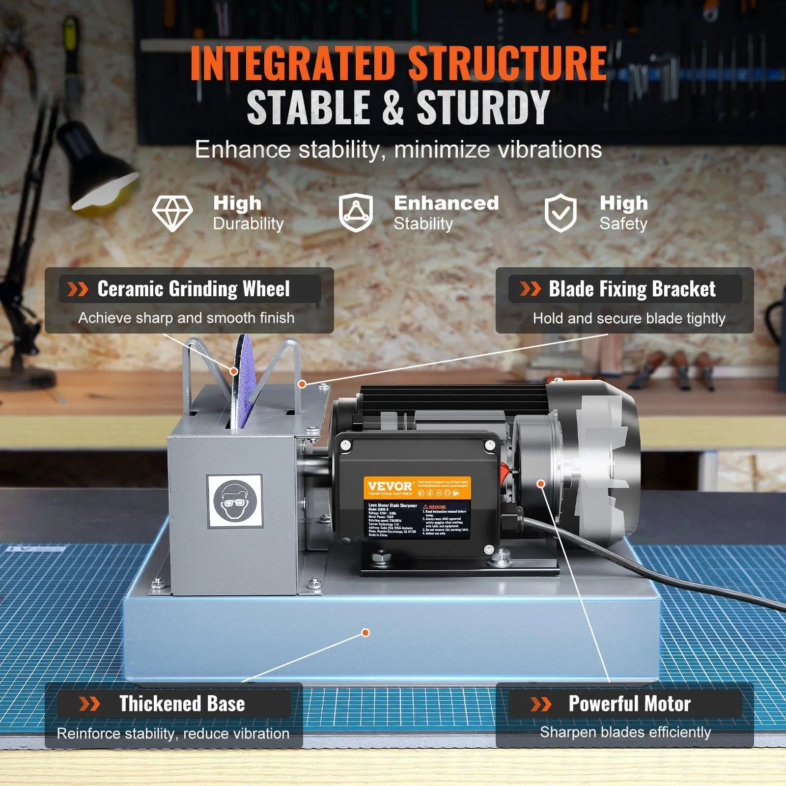 With its integrated structure, solid base, and robust blade fixing brackets, this mower blade sharpener enhances stability and reduces vibration, eliminating wobbling and deformation. Experience a stable and trouble-free sharpening process that streamlines your sharpening tasks.