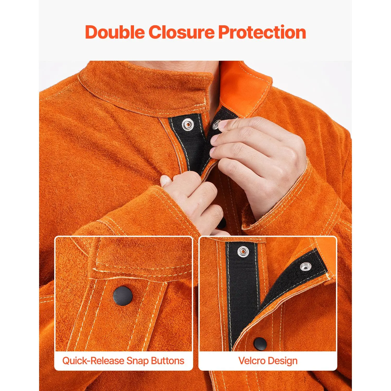 • Enhanced Protection: The combination of heat-resistant snap buttons and velcro closures ensures a snug fit and enhanced seal, blocking high temperatures and sparks. And the adjustable cuffs and turn-down collar further protect your neck and wrists for added safety.