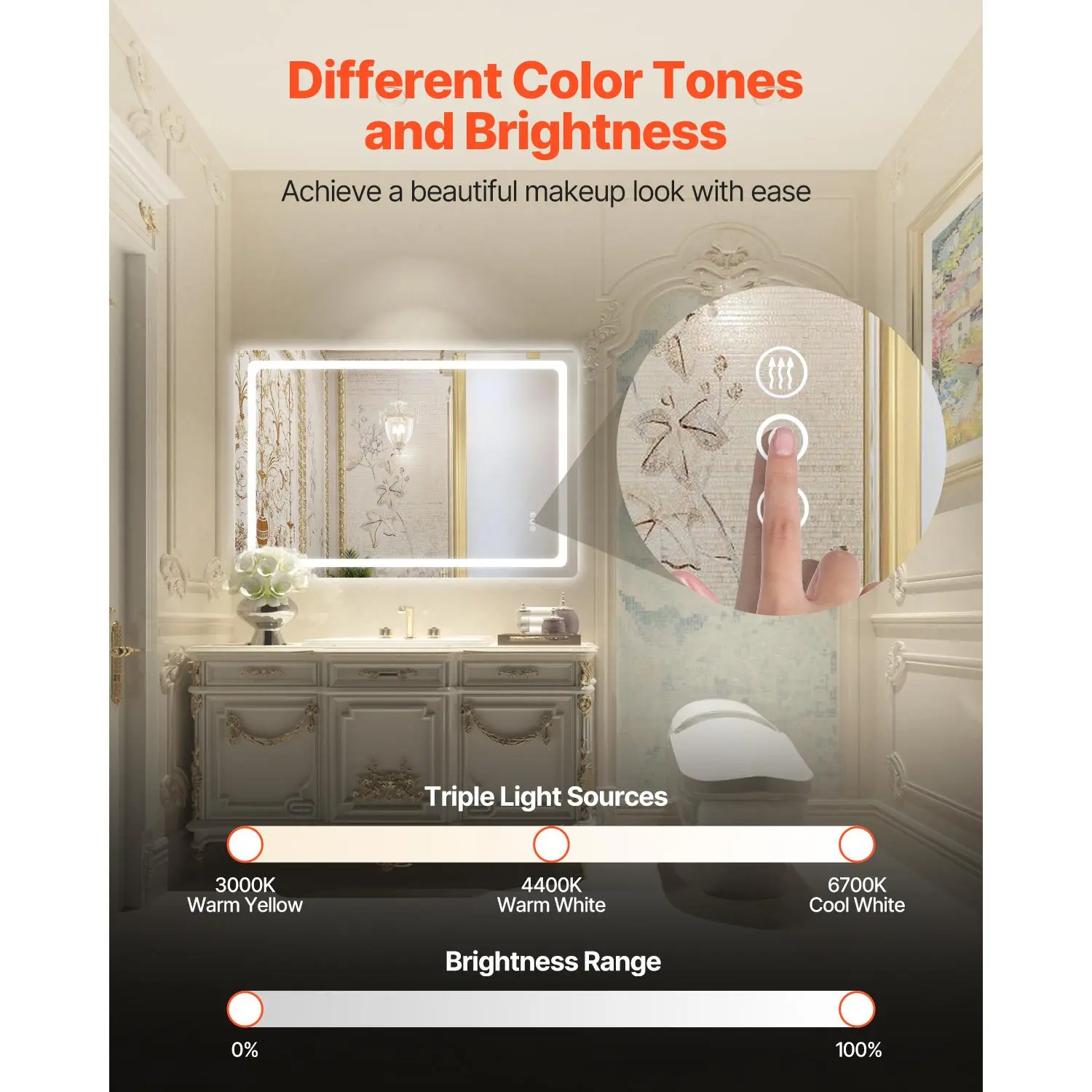 5. VEVOR LED Bathroom Mirror, 32" x 48" LED Bathroom Vanity Mirror with Frontlit and Backlit, Anti-Fog Memory Mirror with Lights, Stepless 3 Colors Temperature Dimmable Bathroom Mirror, Wall Mounted