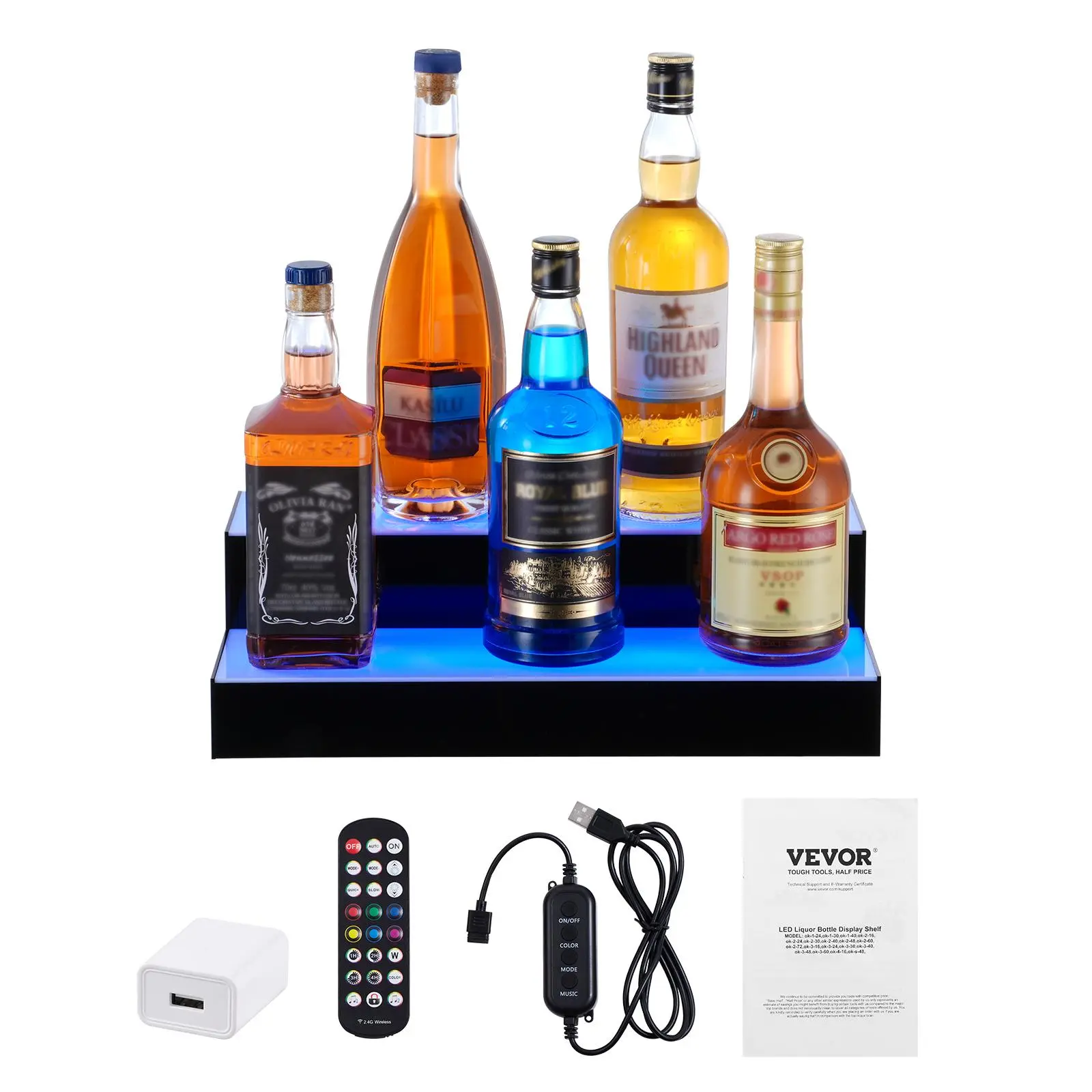 5. VEVOR LED Lighted Liquor Bottle Display, 2 Tiers 16 Inch Commercial Illuminated Home Bar Shelf, 2 Steps Whiskey Rack Stand, Acrylic Drink Shelves with RF Remote & App Control, and Multicolor lighting