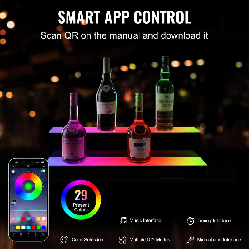 VEVOR LED Lighted Liquor Bottle Display,  , 2 Tiers 24 Inch Commercial Illuminated Home Bar Shelf, 2 Steps Whiskey Rack Stand, Acrylic Drink Shelves with RF Remote & App Control, and Multicolor lighting