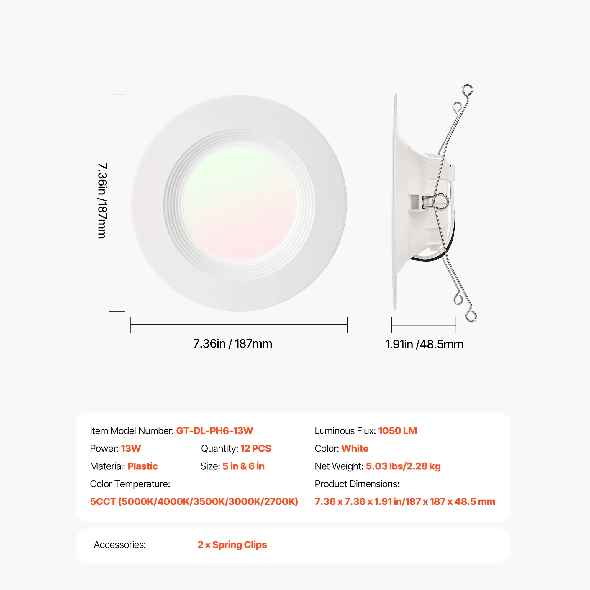 • 5-in-1 CCT Flexibility: Choose from 5 different color temperatures (2700K, 3000K, 3500K, 4000K, 5000K) to match any room's vibe. Whether it's warm and cozy or clean and crisp, you're in control with just a flip of the switch