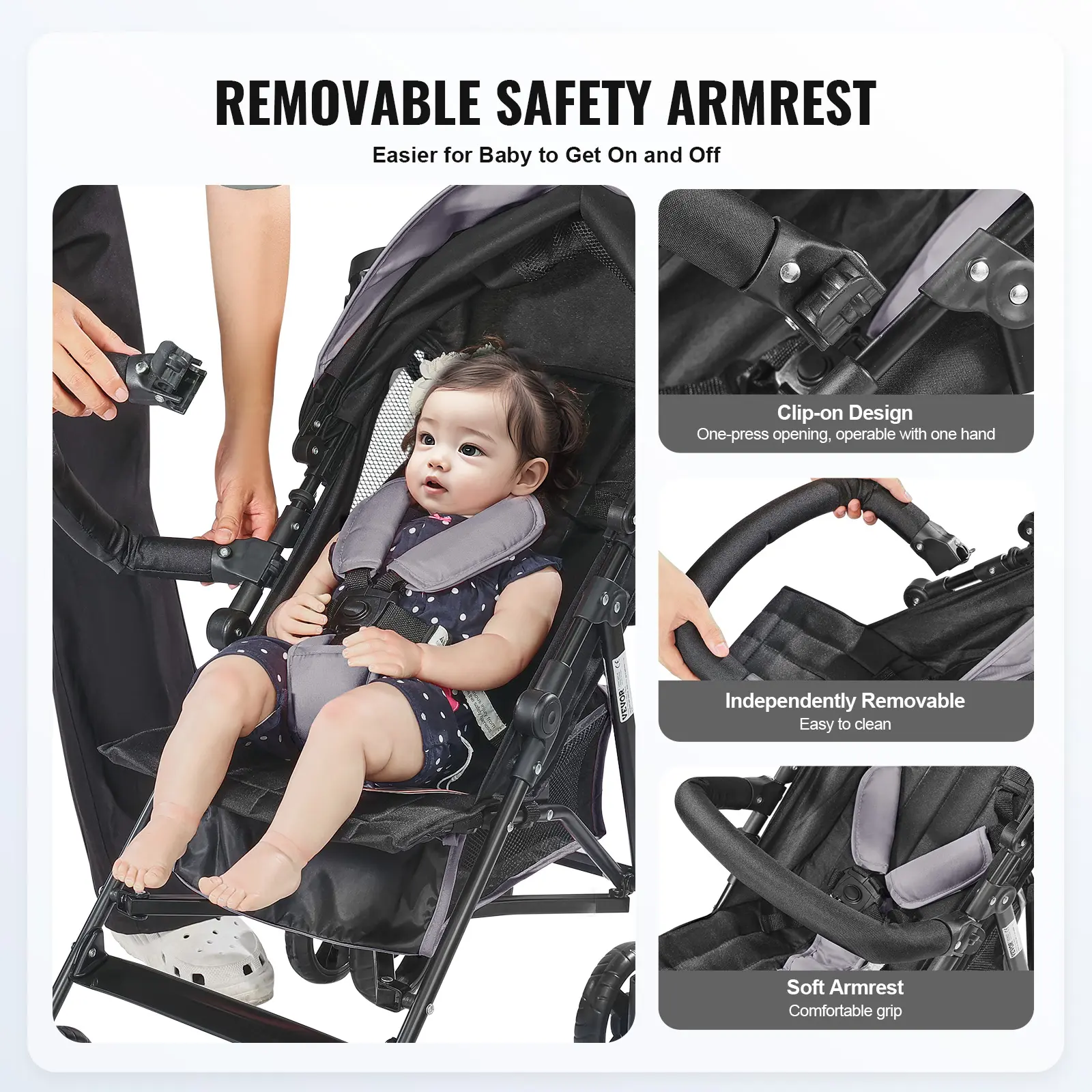 • Safe and Reliable: For active and lively babies, the compact travel stroller comes with a detachable front bar and a user-friendly buckle design for one-hand operation. The five-point safety harness provides double protection to prevent accidental tipping, ensuring your baby's safety.