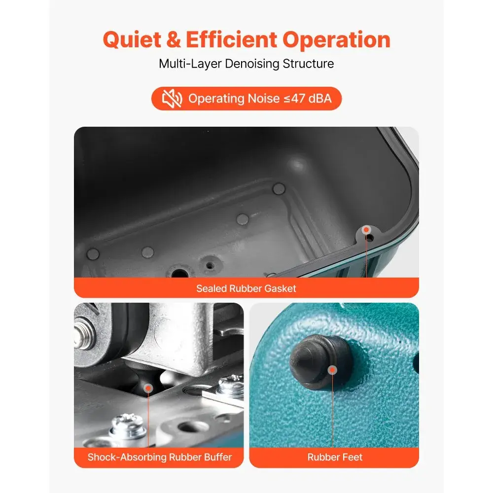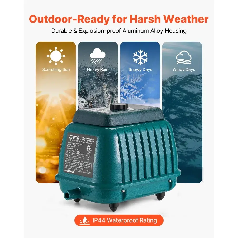 The VEVOR Linear Air Pump features electromagnetic diaphragm compression and a dual-air chamber pressurization structure. It delivers a max flow rate of 2219.04 GPH and a max air pressure of 6.09 PSI. With an applicable depth of ≤11 ft, it promotes efficient airflow. This pump is ideal for septic tanks, aquariums, waste treatment, seafood restaurants, fish farms, and hydroponics.