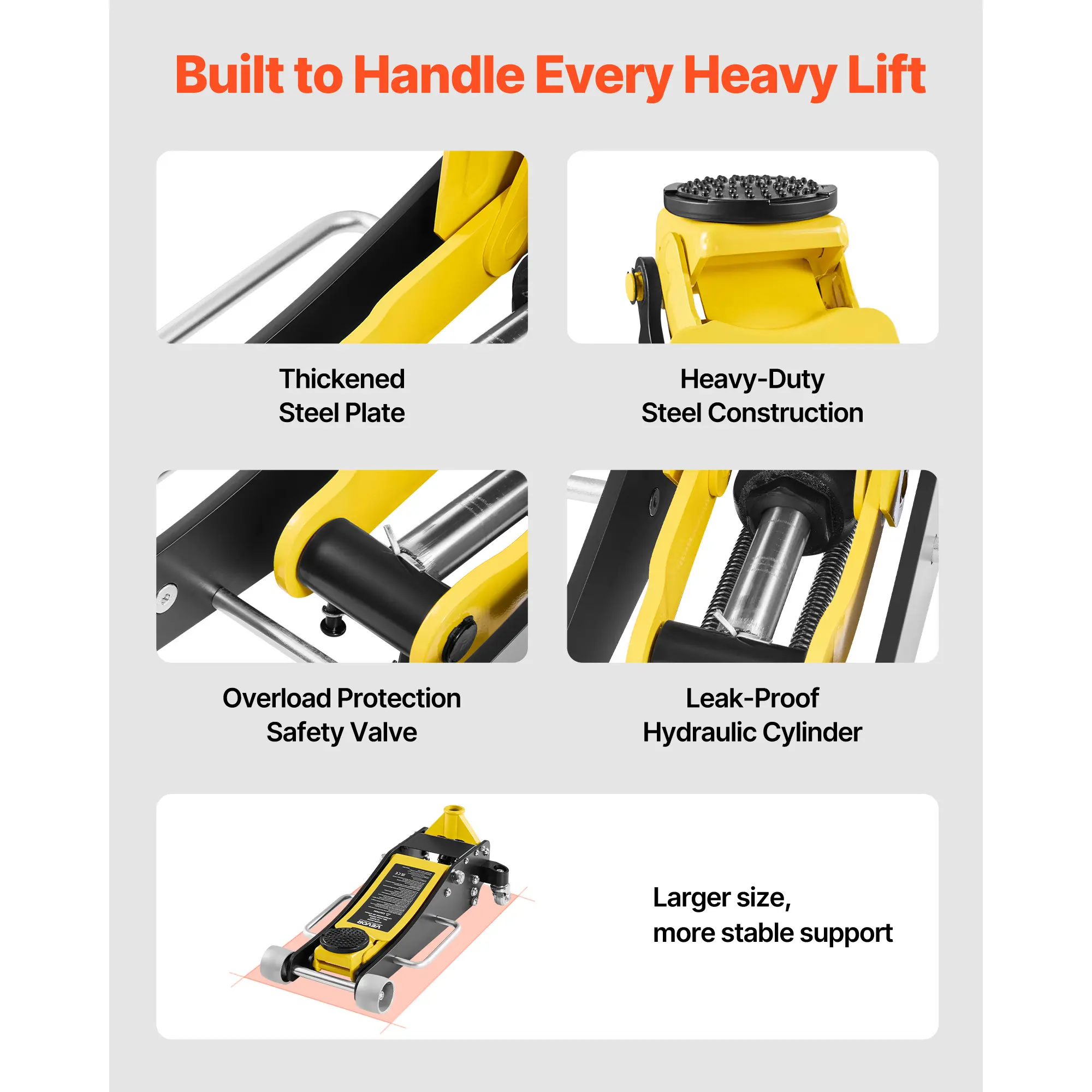 • Dual-Piston Quick Lift: Our hydraulic floor jack uses a dual-piston hydraulic system, reaching full height in just six pumps unloaded—4x faster than single-piston jacks. Even weight distribution and a leak-proof pump ensure stable, fast lifting