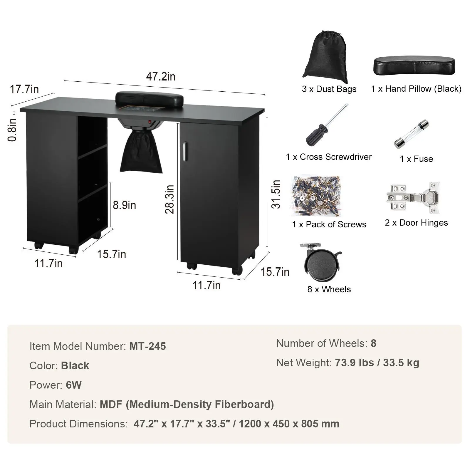 • High-Quality and Easy to Maintain: Crafted from premium medium-density fiberboard (MDF), our sturdy nail desk workstation is resistant to water and bending. It's the perfect blend of practicality and durability for long-lasting manicure service.