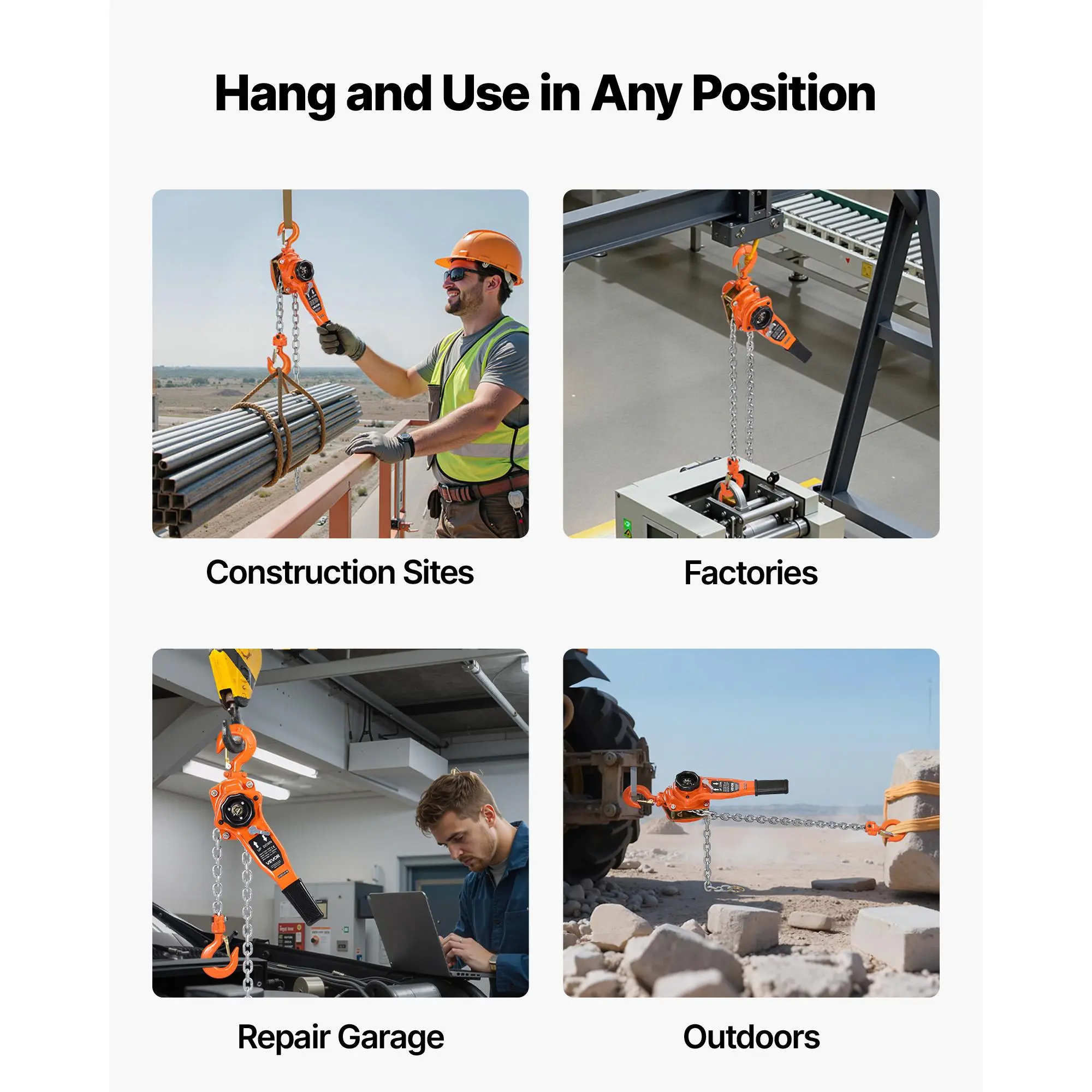This chain fall hoist includes an upgraded guided slot for smooth lifting without jamming. The 360° swivel hook allows secure multi-angle use, avoiding twisting and increasing efficiency for tough lifting applications.