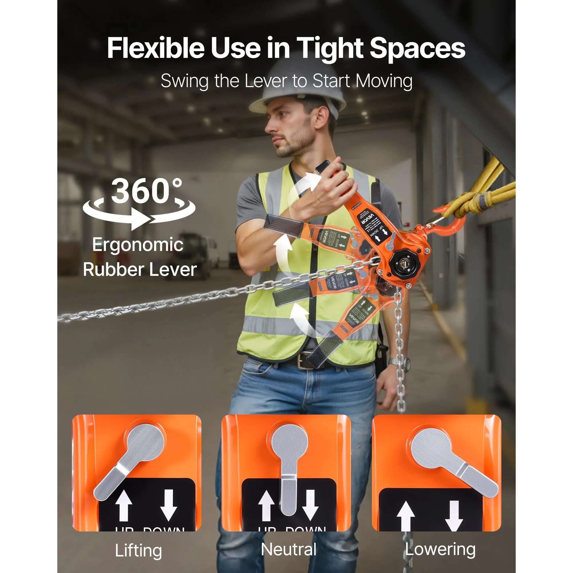 The lever chain hoist includes a 360° rotating ergonomic handle with a non-slip grip. Heavy loads can be shifted with minimal effort, perfect for confined work areas. A three-position selector switches between lifting, neutral, and lowering modes.