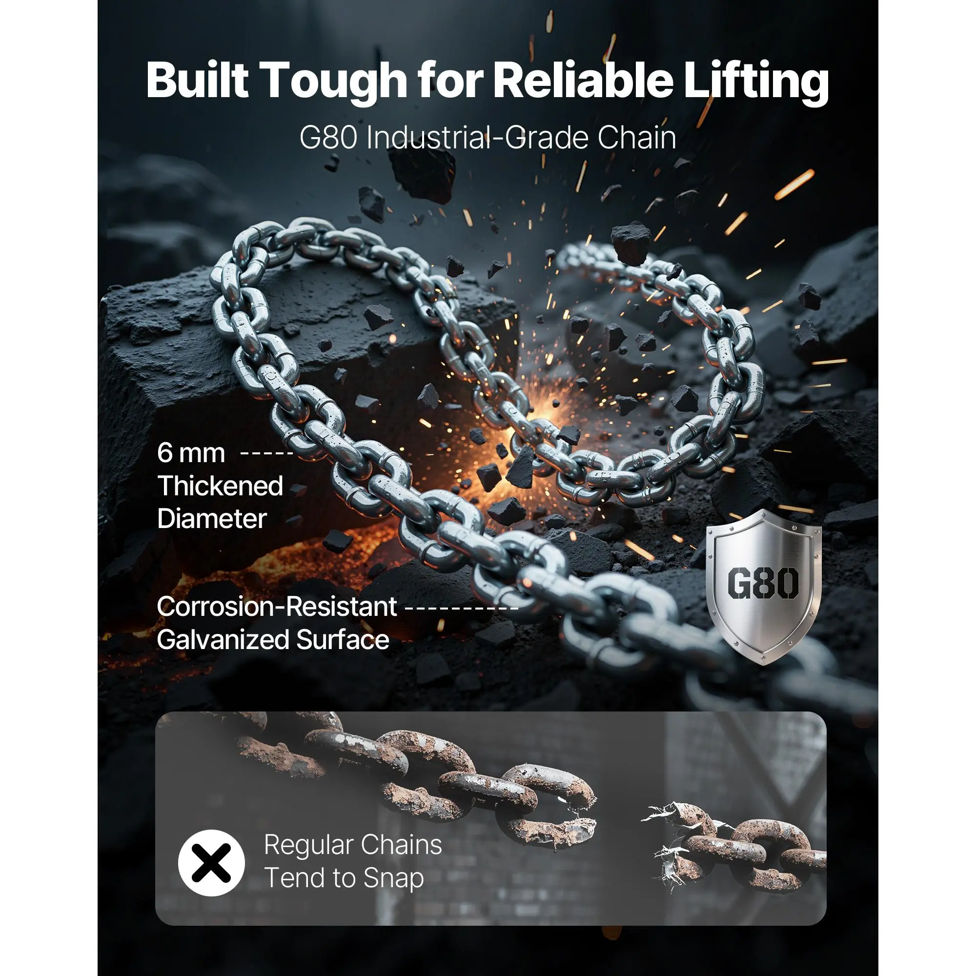 The chain hoist comes with a 10 ft/3 m G80 alloy chain, 6 mm thick, galvanized for corrosion-resistance. Strong and sturdy, it ensures reliable lifting in construction, warehouses, and industrial tasks.