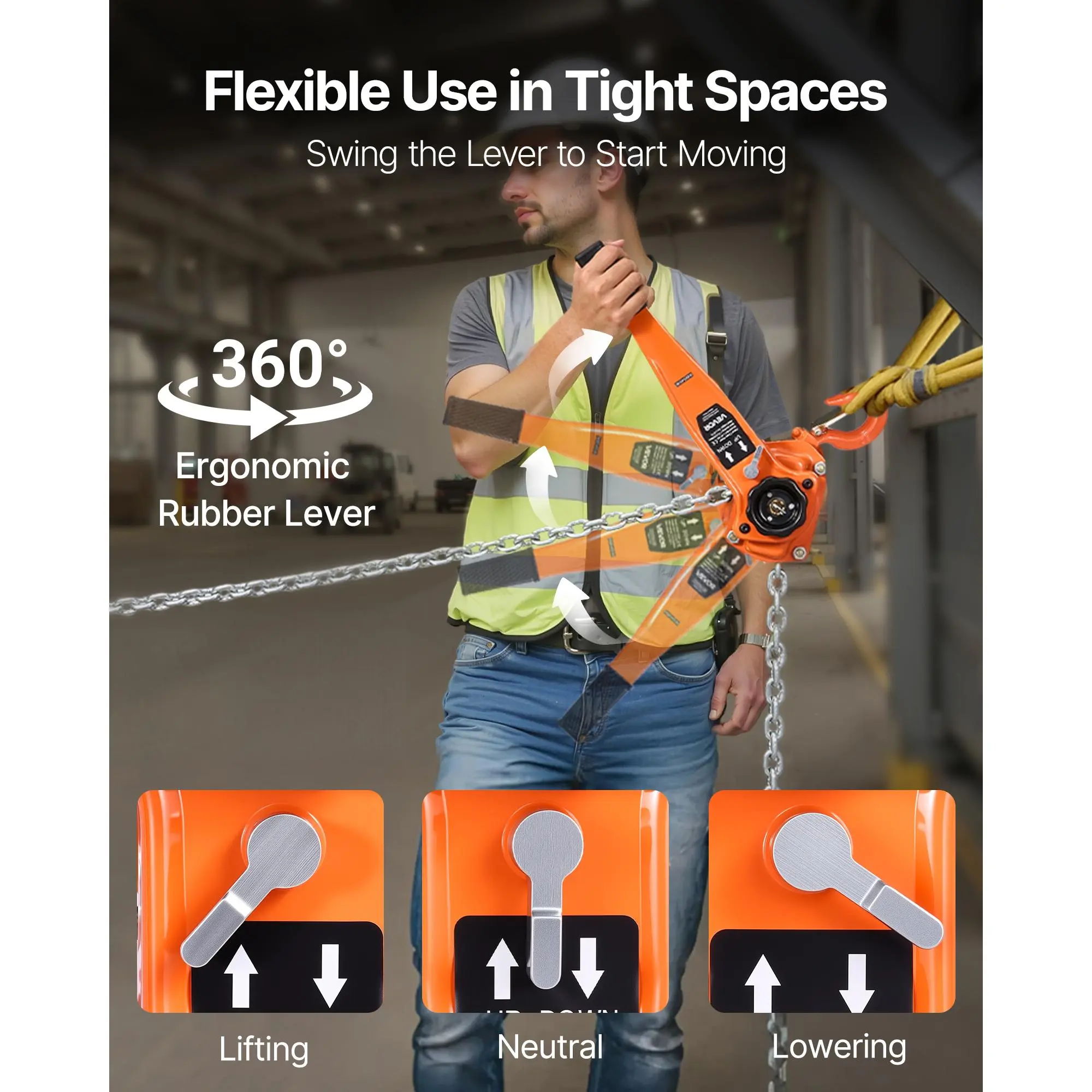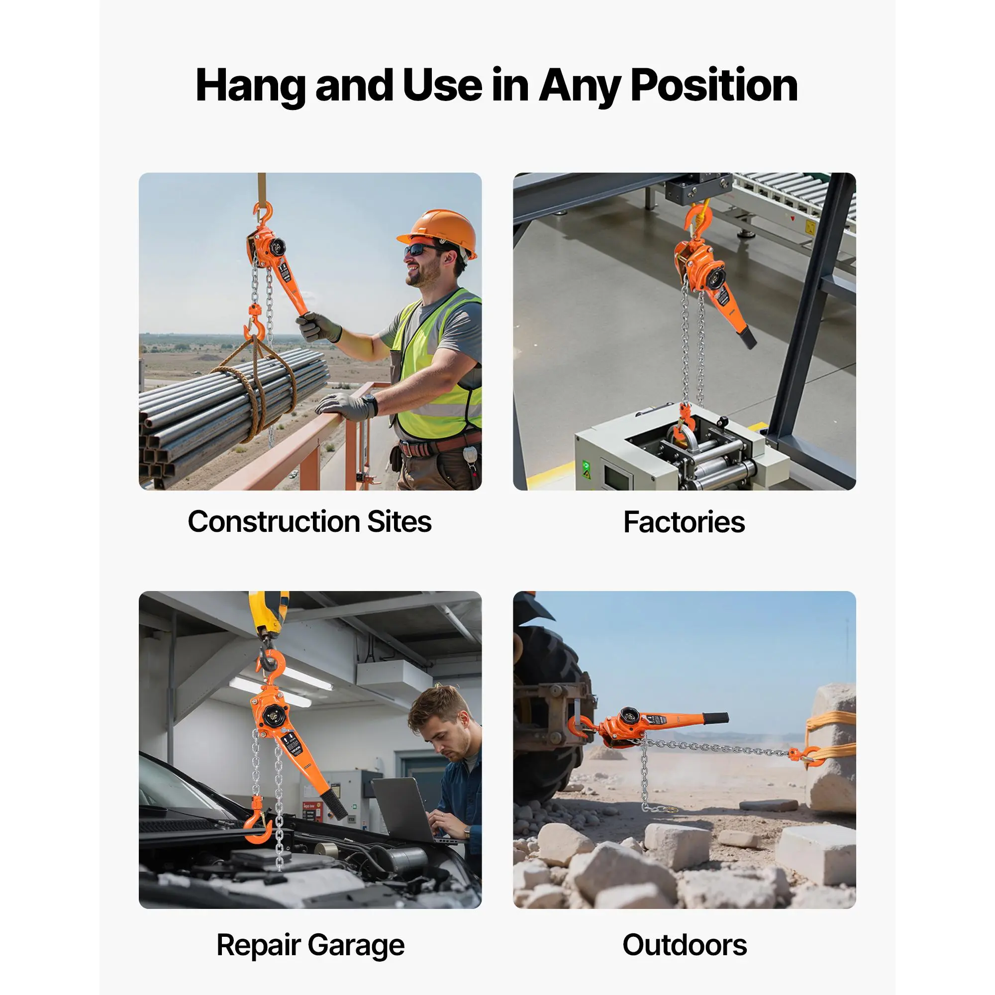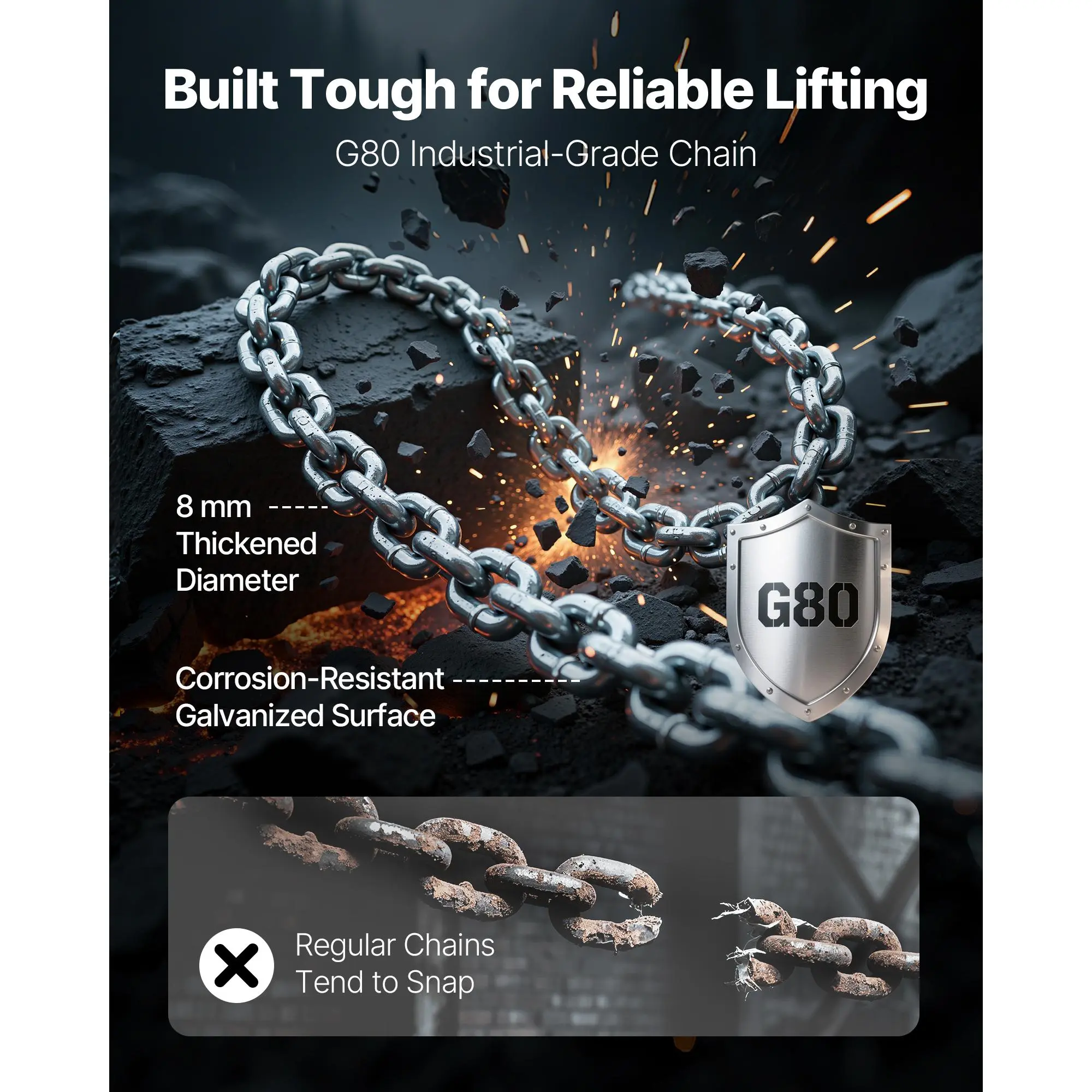 • Comes with a 10 ft/3 m G80 alloy chain, 8 mm thick, galvanized for corrosion resistance. Strong and sturdy, it ensures reliable lifting in construction, warehouses, and industrial tasks.
