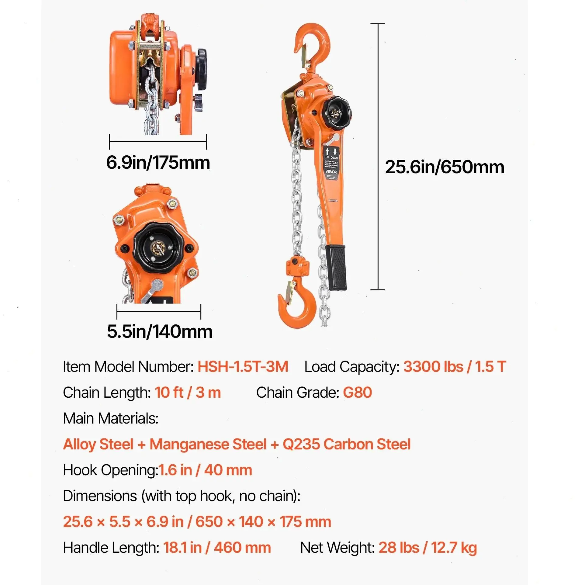 • 1.5T Max Load: This hoist boasts all-steel construction, resisting impact and breakage. One person can effortlessly move loads up to 1.5T / 3300 lbs. Perfect for dragging fallen trees, lifting steel beams, and machinery.