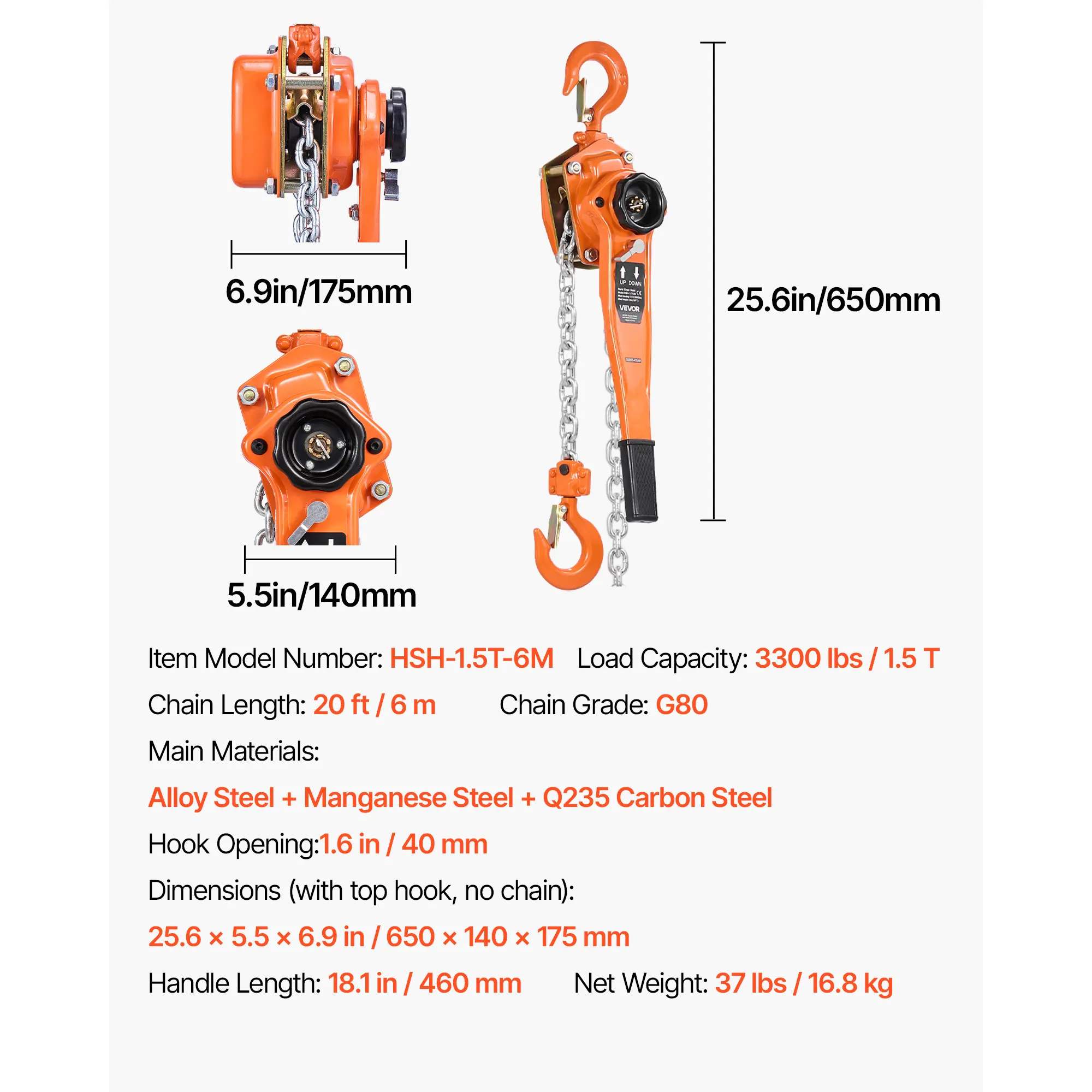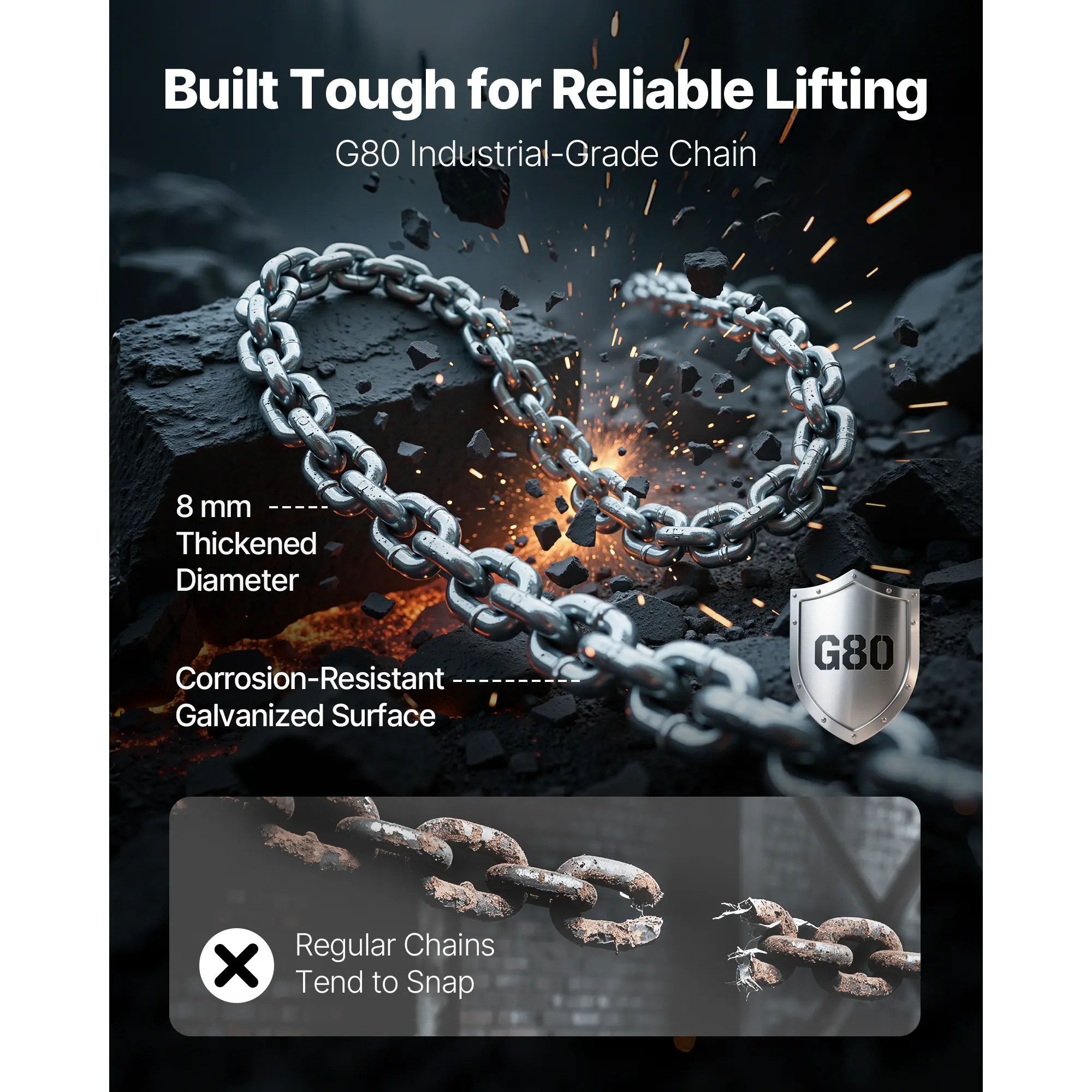• G80 Industrial-Grade Chain: The chain hoist comes with 20 Ft / 6 m G80 alloy chain, 6 mm thick, galvanized for corrosion-resistance. Strong and sturdy for harsh work, ensuring reliable lifting in construction, warehouses, and industrial tasks