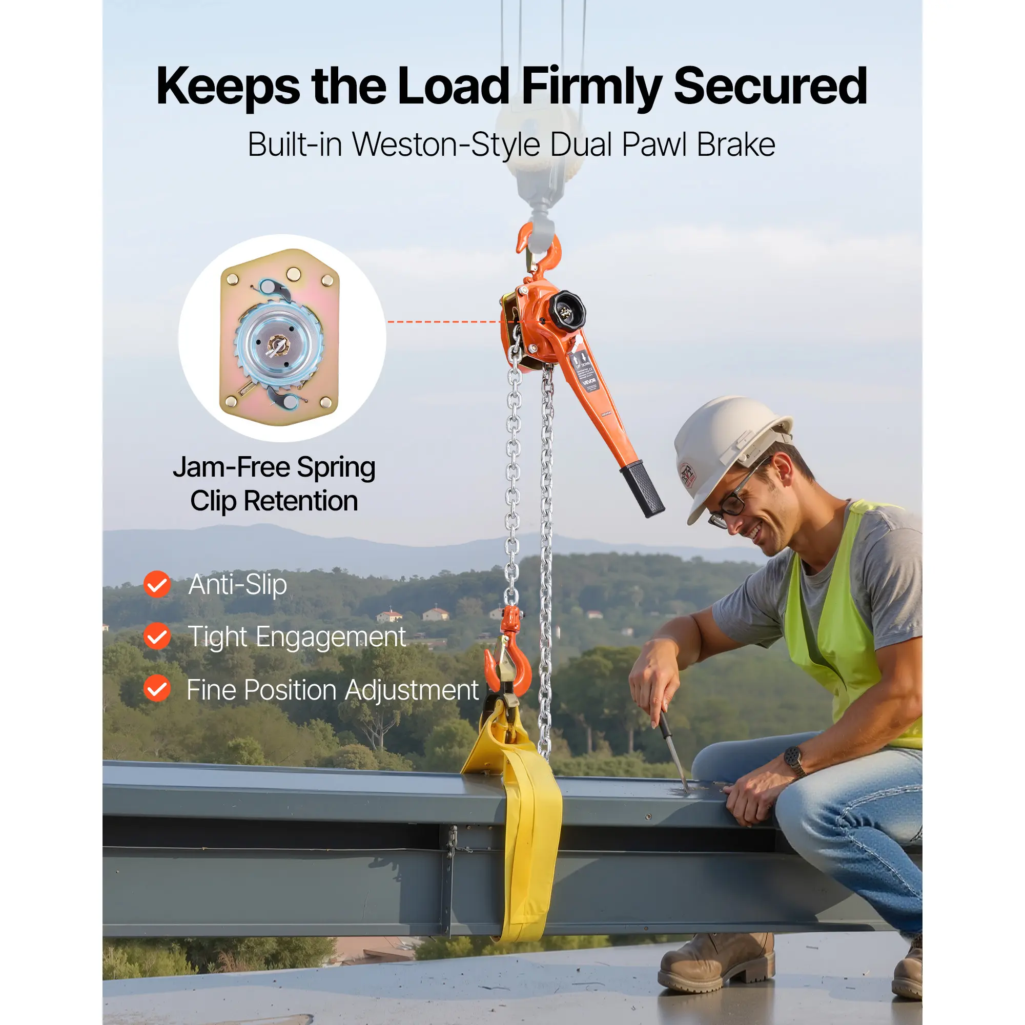 • Secure and Reliable Braking: This manual chain hoist features Weston dual pawl brake engaged with gears for precise control. Strong build avoids slipping and sudden drops, evenly spreads pressure, boosting security and extending service life