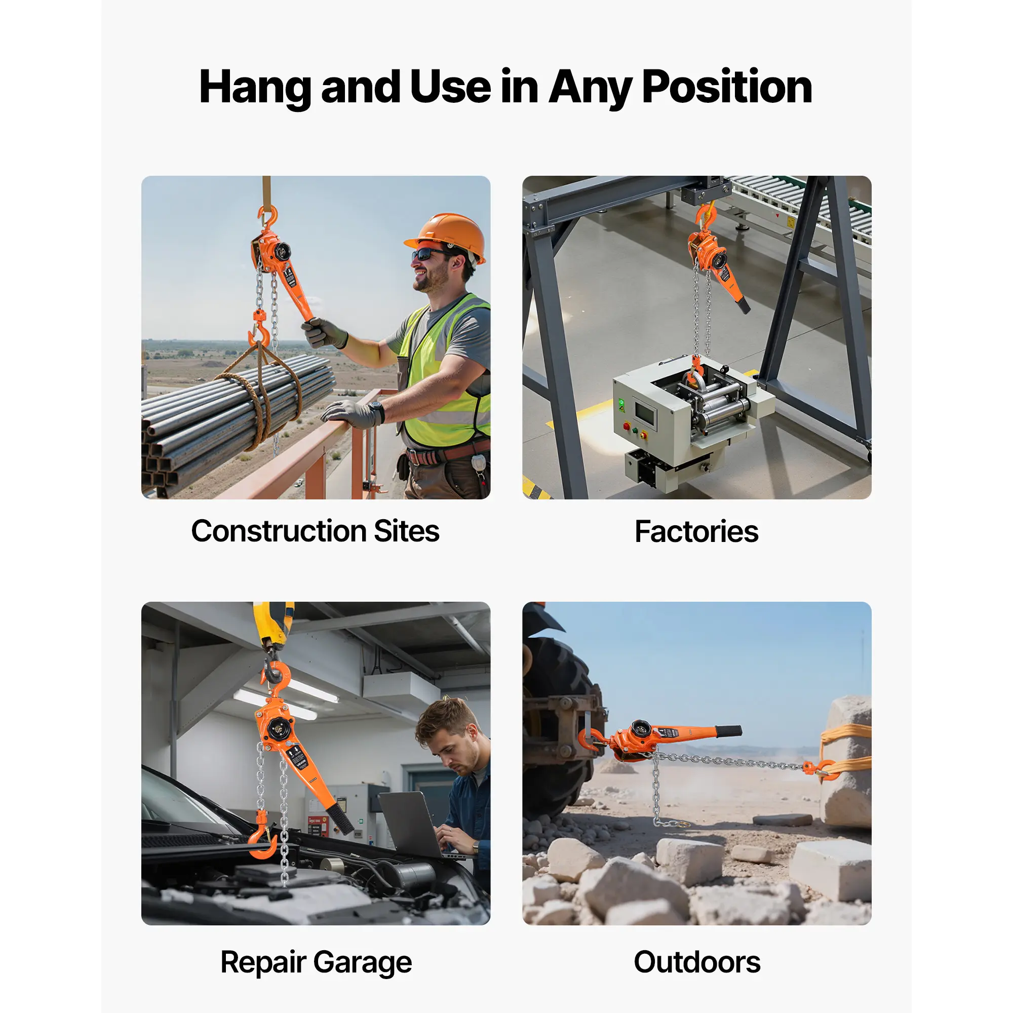 • Easy Operation: Our lever chain hoist includes a 360° rotating ergonomic handle with non-slip grip. Heavy loads can be shifted with minimal effort, for confined work areas. A three-position selector can switch between lifting, neutral, and lowering modes