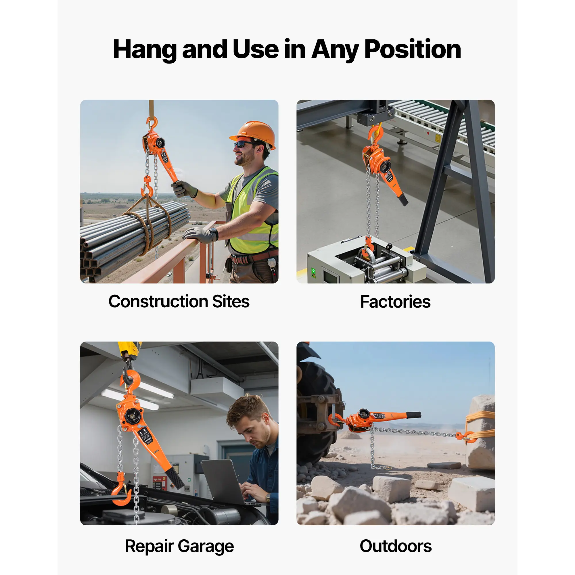The chain hoist includes an upgraded guided slot for smooth lifting without jamming. The 360° swivel hook allows secure multi-angle use, avoiding twisting and increasing efficiency for tough lifting applications. 🔄