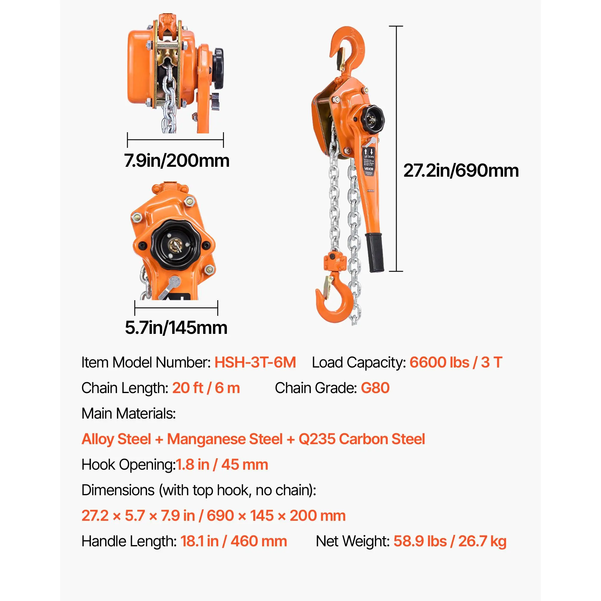 VEVOR Manual Lever Chain Hoist,  , 3T 6600LBS Capacity Heavy Duty Come Along, 20FT Lift G80 Alloy Steel Chain With Dual Pawl Mechanical Brake,360°Rotating Hooks, for Warehouse Construction Garage
