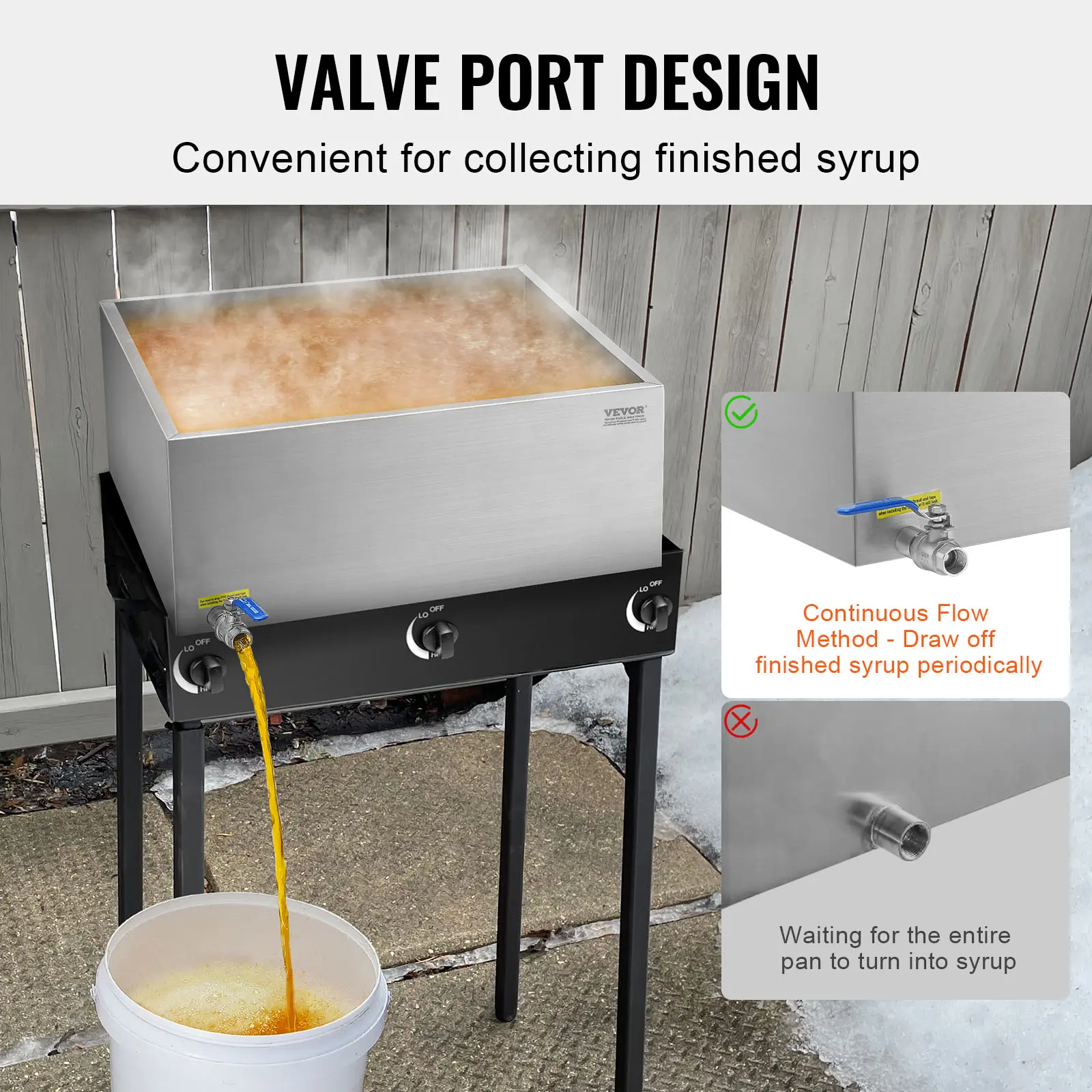• High Processing Capacity: This maple evaporator processes up to 24.9 gallons of sap per batch, producing approximately 362 cups of 8.8 oz maple syrup. It features an adjustable valve for convenient flow control, allowing easy transfer of syrup into other containers.
