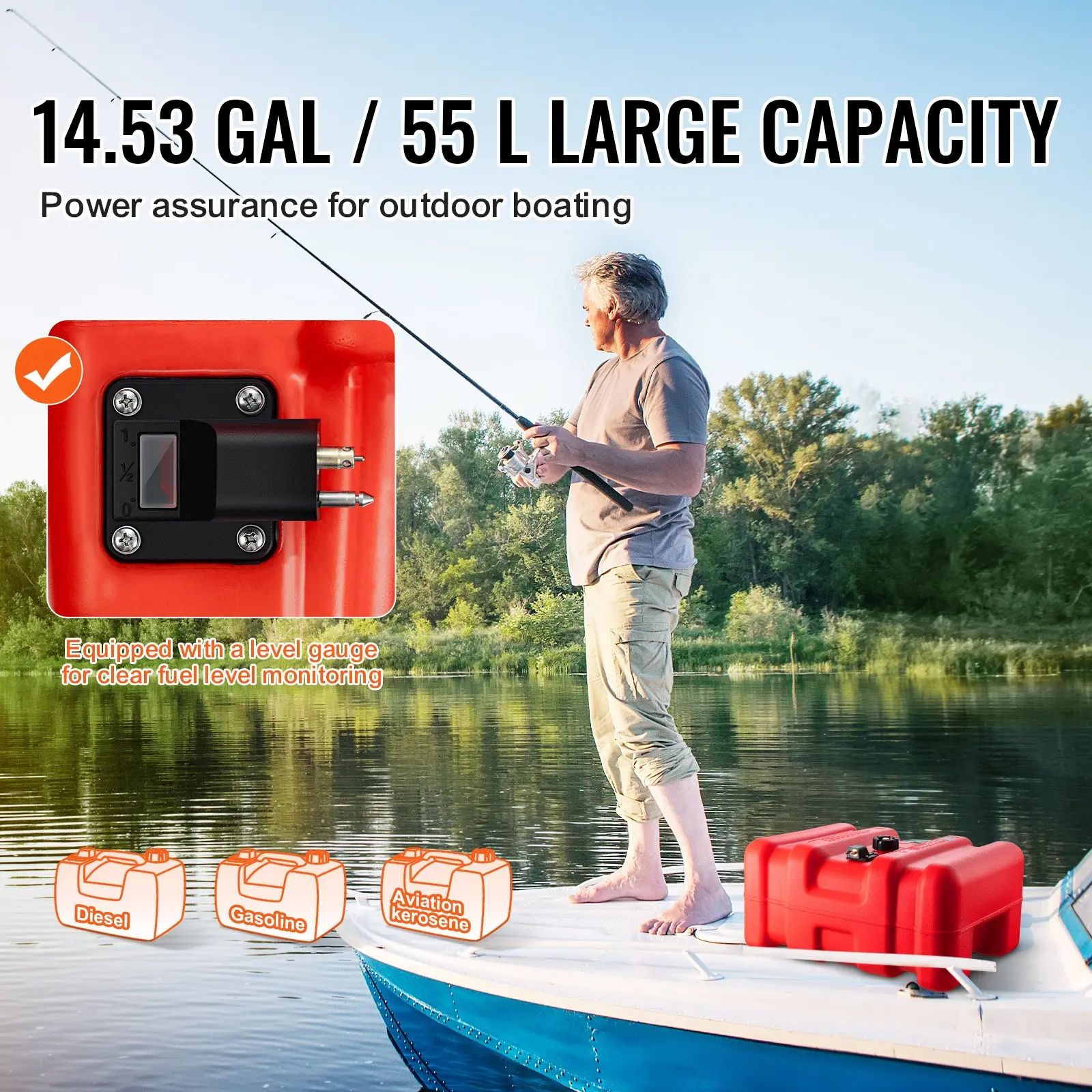 Ready for some outdoor boating fun? Our 14.53 gal/55L high-capacity marine fuel tank provides backup support for your outdoor boating adventures.