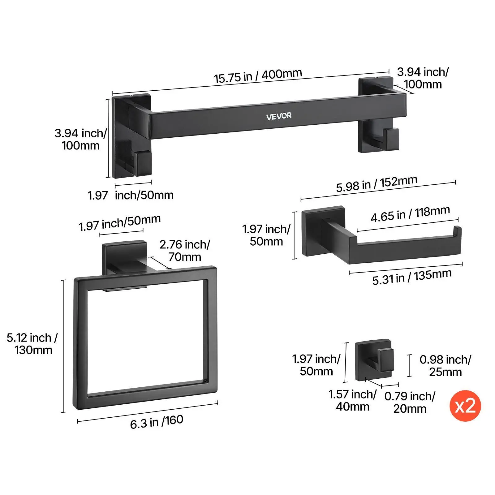 • Versatile Combination Set: This 5-piece bathroom hardware set includes a 15.75-inch towel bar with hooks, a towel rack, a toilet paper holder, and 2 robe hooks. The well-designed combination meets all your bathroom storage needs without leaving any piece unused. The towel bar features 2 additional hooks for extra storage, making it even more practical
