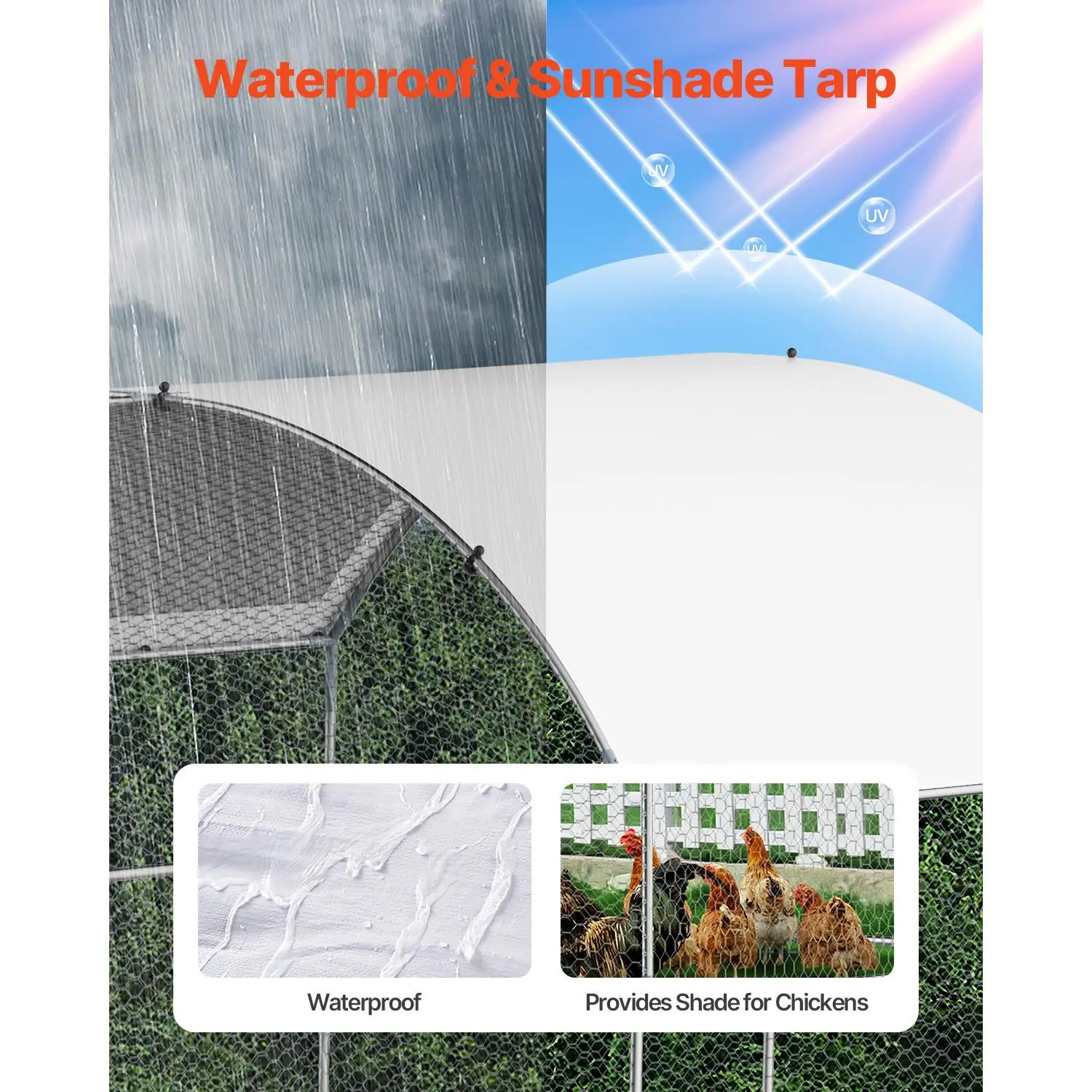 • Spacious Living Area: This metal chicken run with a generous 9.8x19.3x6.5 ft of space, features four-sided ventilation, creating a healthy and comfortable environment. The PE-coated canopy provides sun protection, waterproofing, and tear resistance, shielding your poultry from external elements.