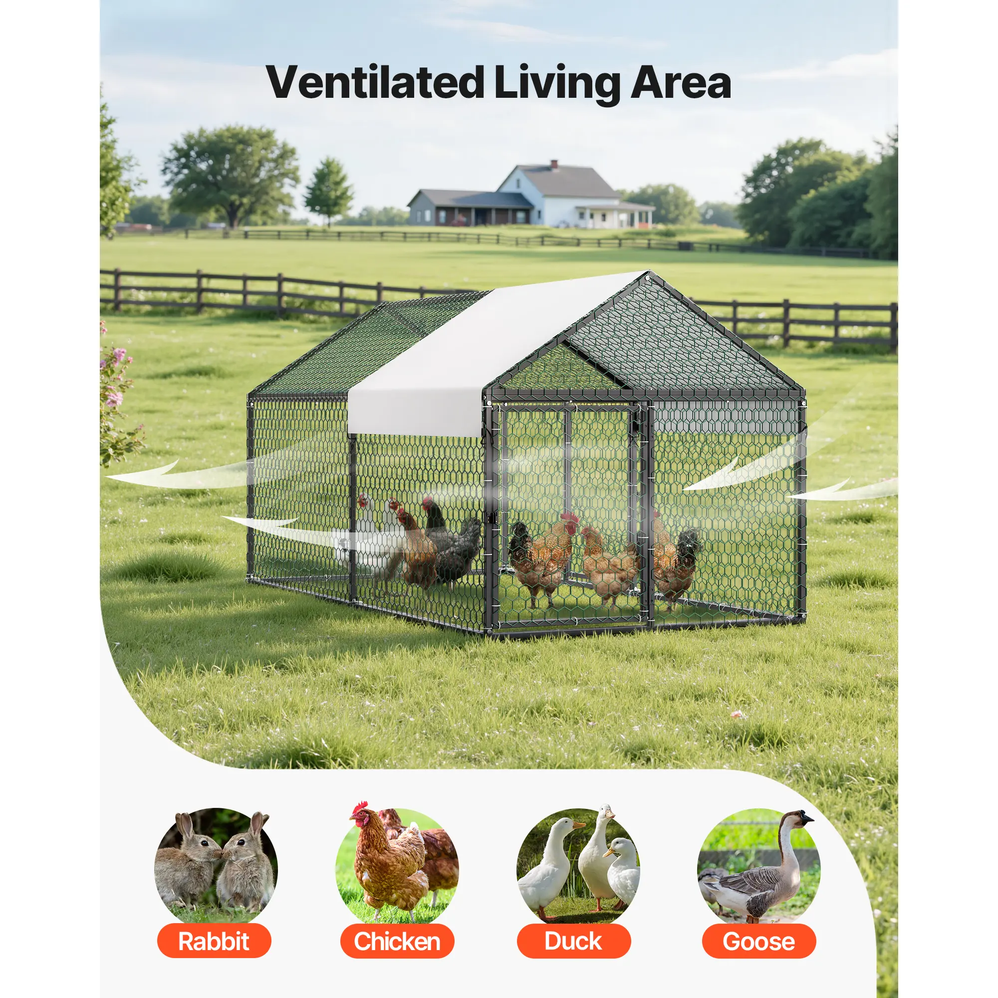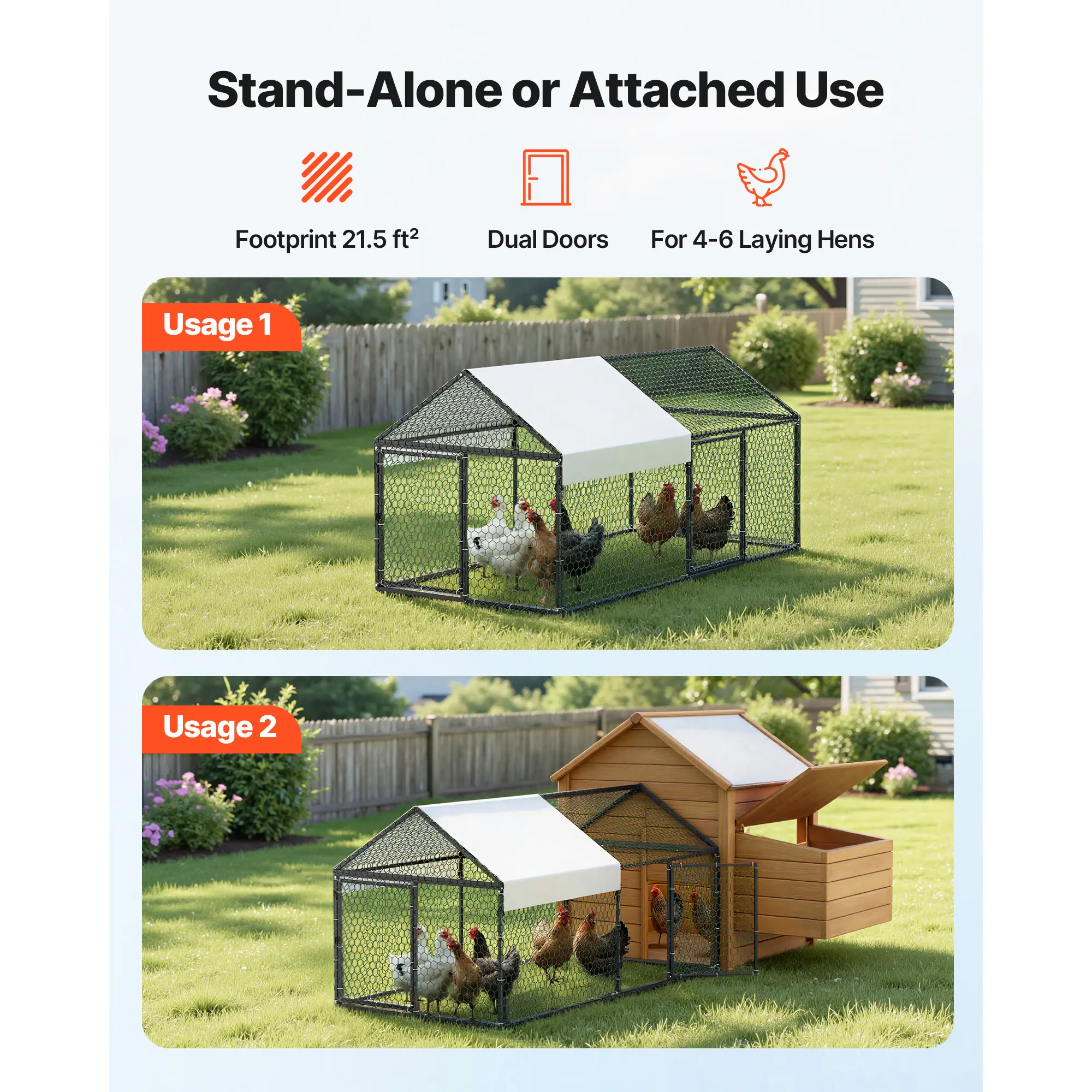 • Compact & Efficient Space: Ideal for 4–6 chickens or bantams, this small metal chicken coop provides a functional roaming area. Dual doors allow easy access, while open mesh walls ensure excellent ventilation. Can be paired with a nesting box coop