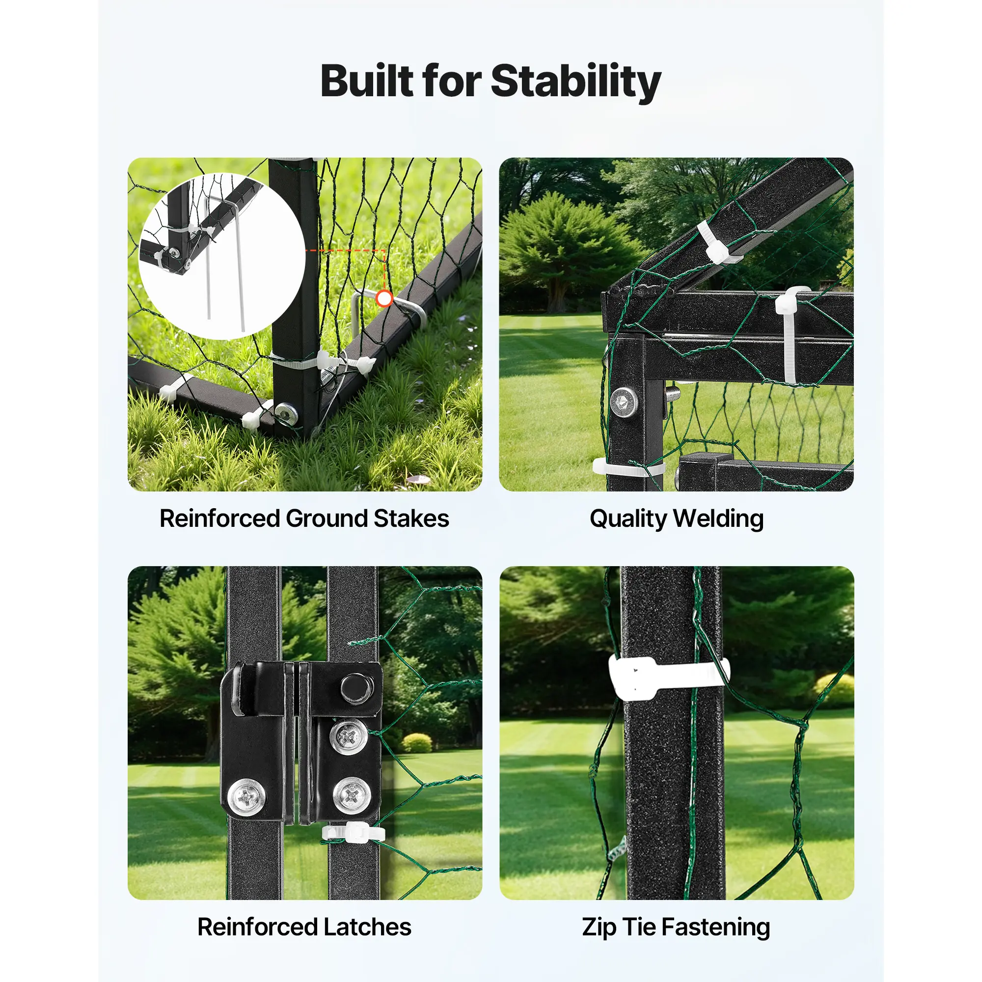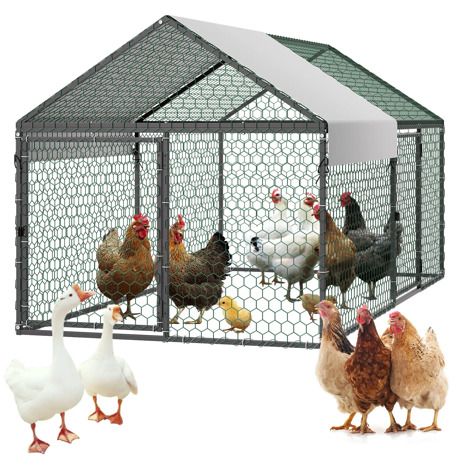 • Reinforced Square Tube Frame: Made from corrosion-resistant carbon steel square tubes and secured with U-shaped ground stakes for stability. The small chicken run is designed to withstand strong winds, heavy snow, and harsh weather for long-lasting durability