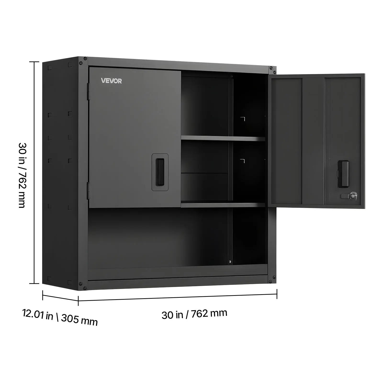 This 30 x 12.01 x 30-inch metal wall cabinet optimizes wall space, supporting up to 120 lbs per shelf. It features three adjustable levels for storing various-sized tools and supplies effortlessly. The compact design ensures efficient use of vertical space, making it perfect for garages, basements, kitchens, or warehouses. Assembly is required for this black cabinet.