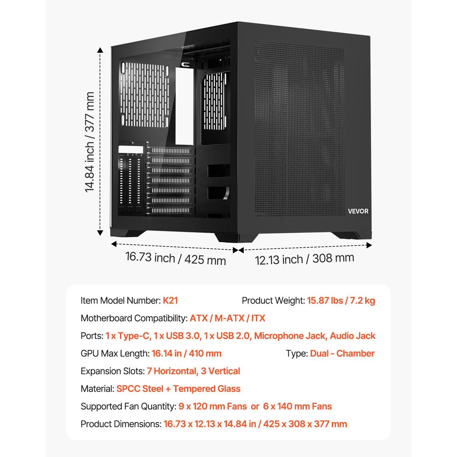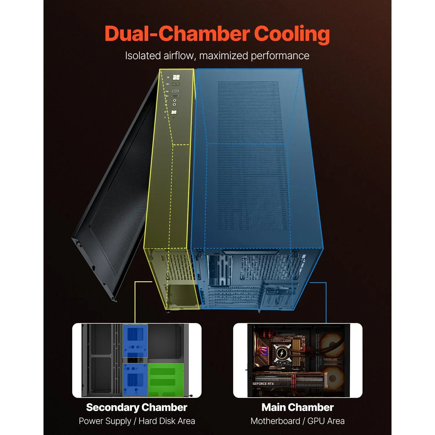 • Dual-Chamber Mid Tower Structure: Featuring a unique dual-chamber design, this PC gaming case effectively separates heat-producing components (like the CPU and GPU) from the power supply. This configuration enhances cooling performance, making it ideal for high-performance gaming enthusiasts