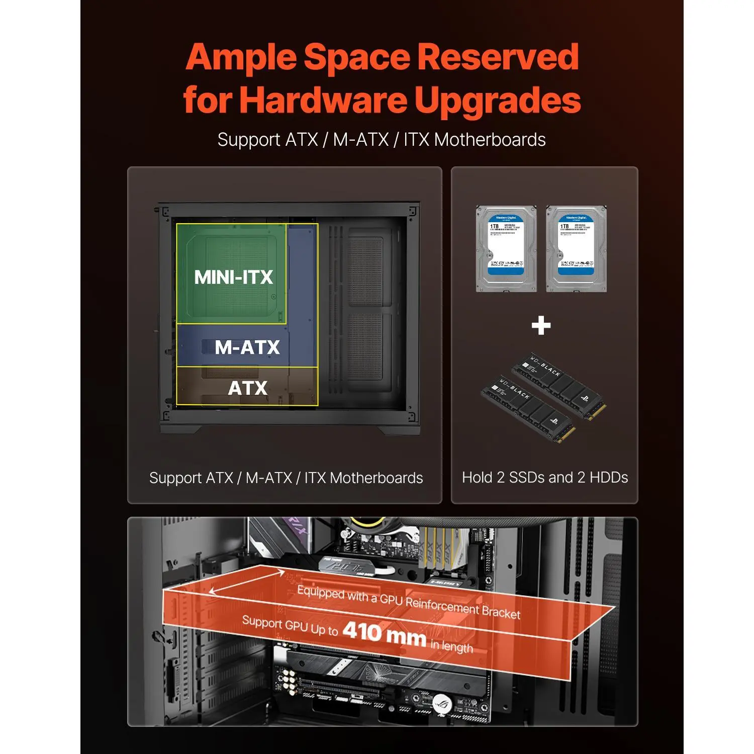 • Versatile Expansion Design: Compatible with ATX/M-ATX/Mini-ITX motherboards and supports GPU up to 410 mm (16.14 in) in length. This gaming computer case comes with 2 x 2.5-inch SSD slots and 2 x 3.5-inch HDD bays, ensuring fast boot times and flexible storage expansion