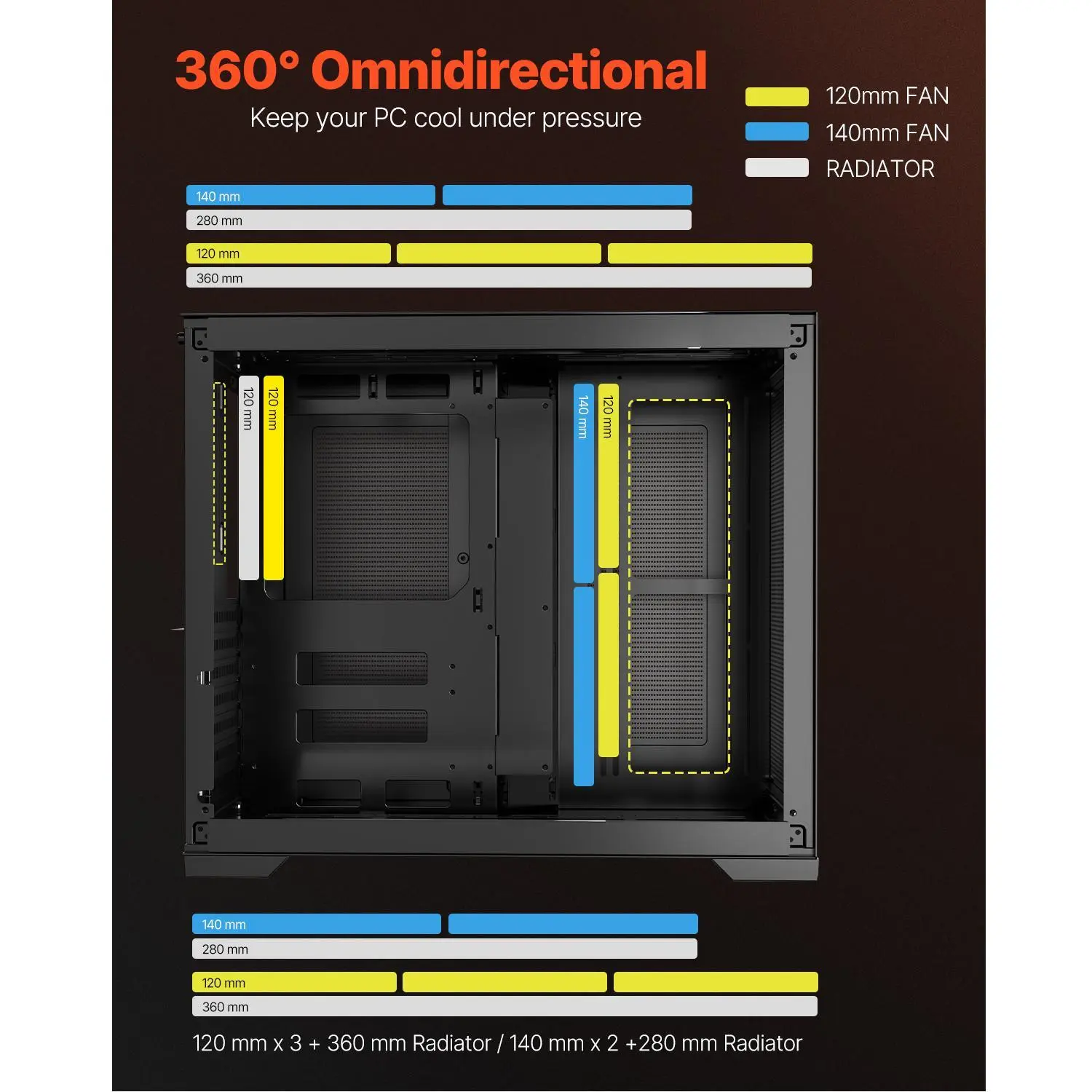 • Exceptional Cooling Solution: Supports up to 9 x 120 mm (4.72 in) fans or 6 x 140 mm (5.51 in) + 1 x 120 mm (4.72 in) fan configuration, this PC case ensures exceptional cooling efficiency. Keep your system at optimal temperatures during intense gaming sessions, avoiding overheating
