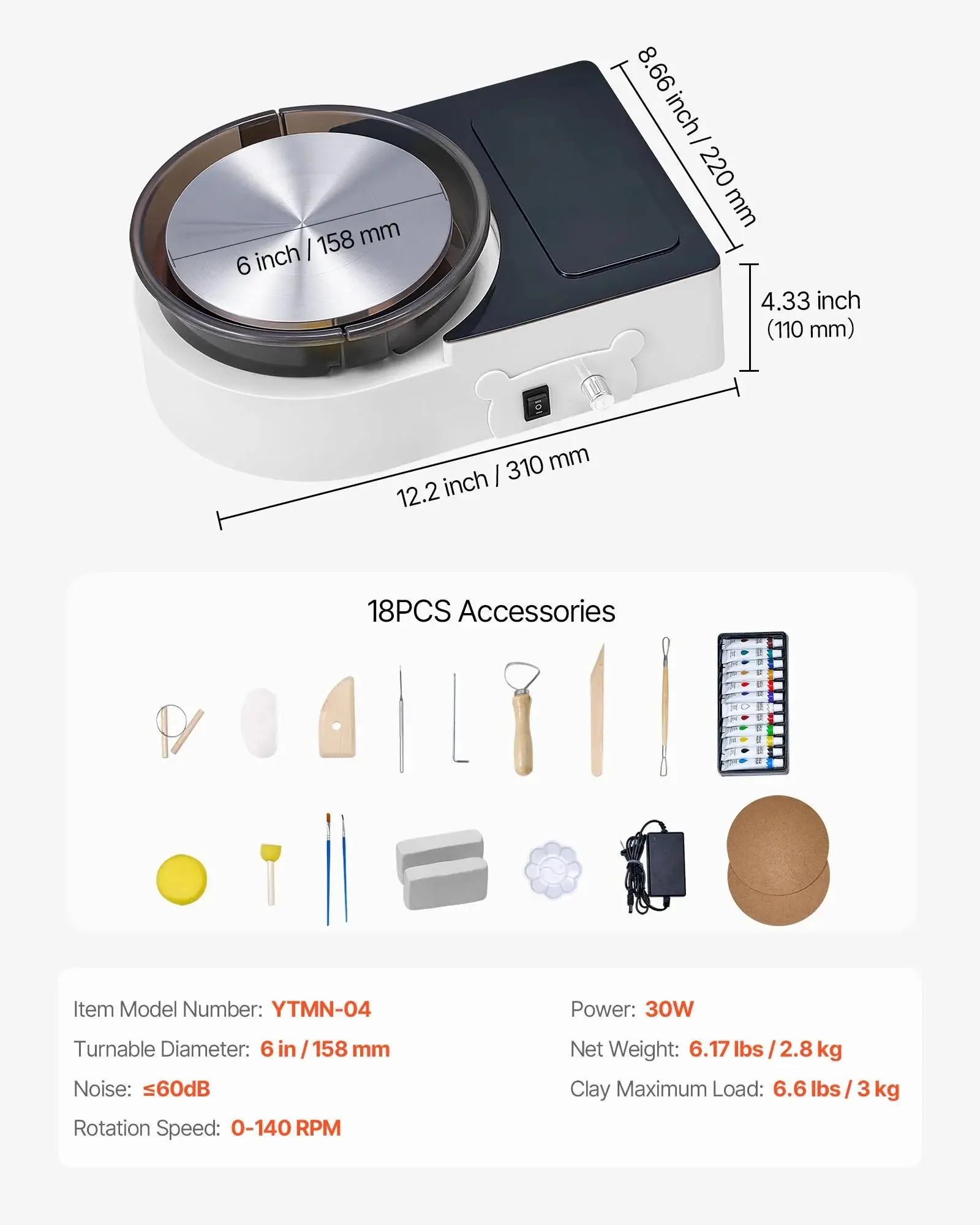 ✨ Mini Pottery Wheel: This compact wheel is powered by a robust 30W motor, equipped with a 6-inch aluminum alloy turntable. It supports up to 6.6 lbs of clay, perfect for both kids and adults. Ideal for exploring ceramic art, it ensures durability and stability.