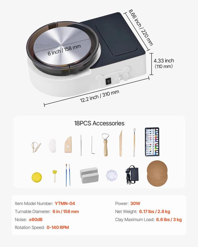 5. VEVOR Mini Pottery Wheel, , 6 inch Turntable, Forward and Reverse Rotation, Adjustable Speed, Electric Clay Wheel for Kids and Adults, with Clay Shaping Tools, for Home DIY, Pottery Classes, White