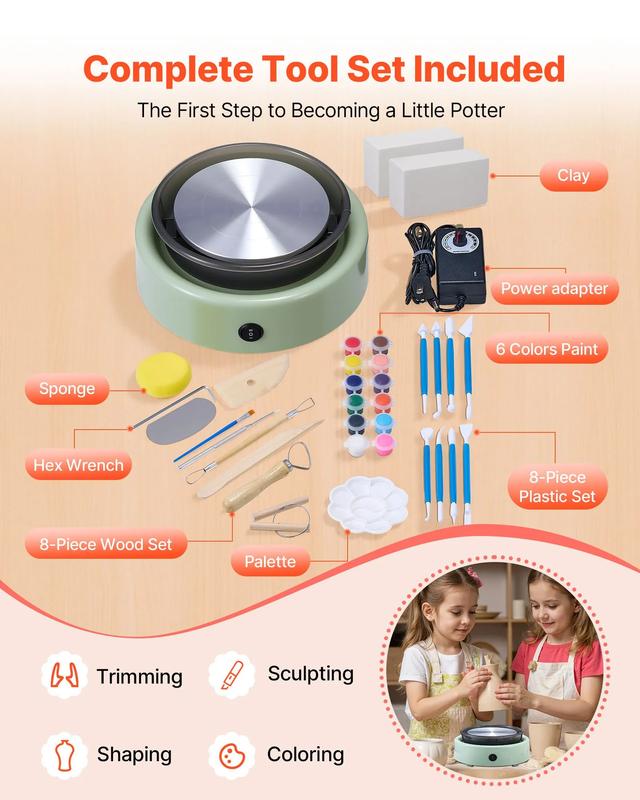 The small pottery wheel comes with plastic and wood shaping tools, paints, palette, clay, brush, apron, adapter, and hex wrench. From sculpting to shaping and painting, kids have everything they need to explore creativity. No additional tools required.