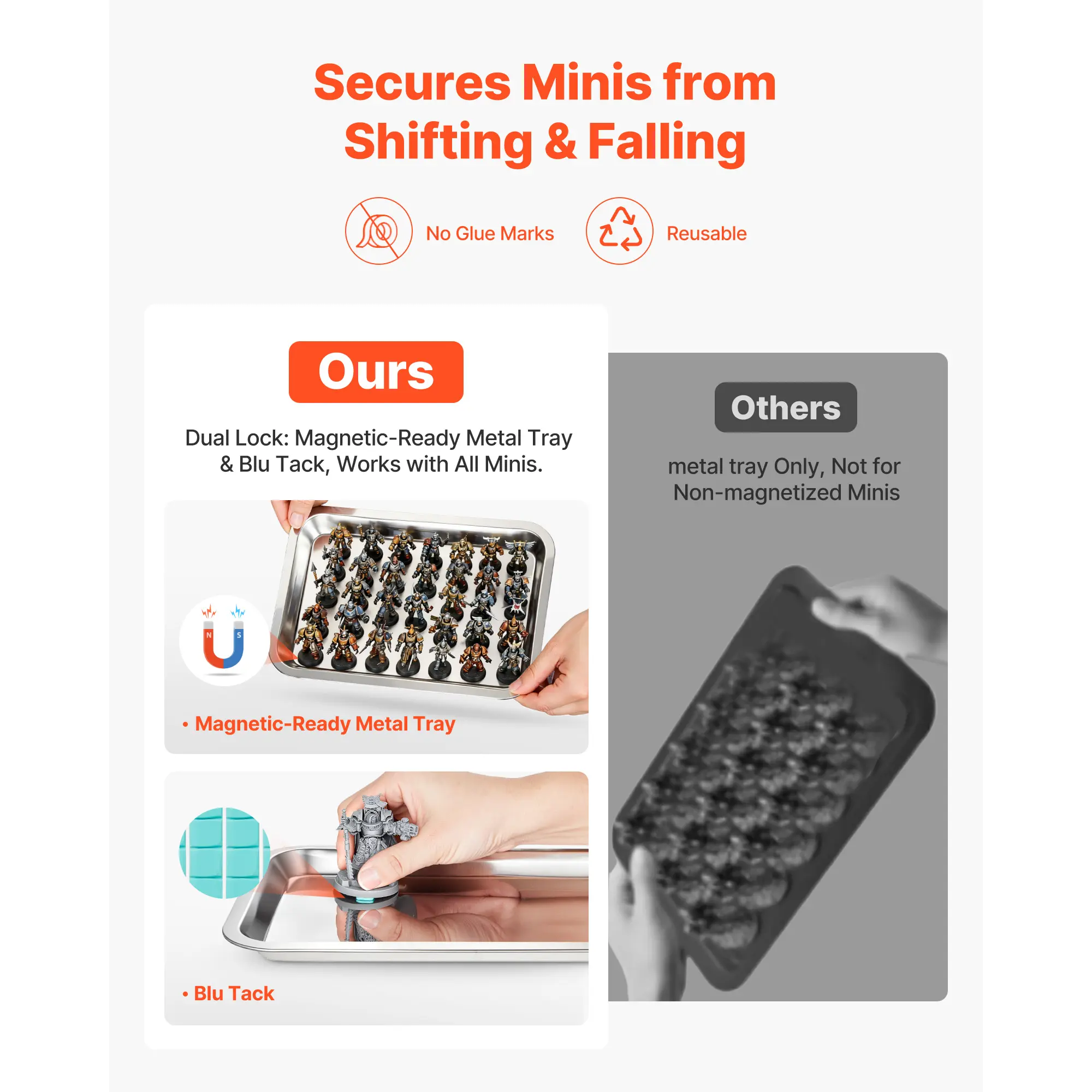 • Dual Hold: This miniature transport case uses slide-out carbon-steel magnetic trays plus reusable poster putty. You secure models with a snug, no-shift grip for steadier transport