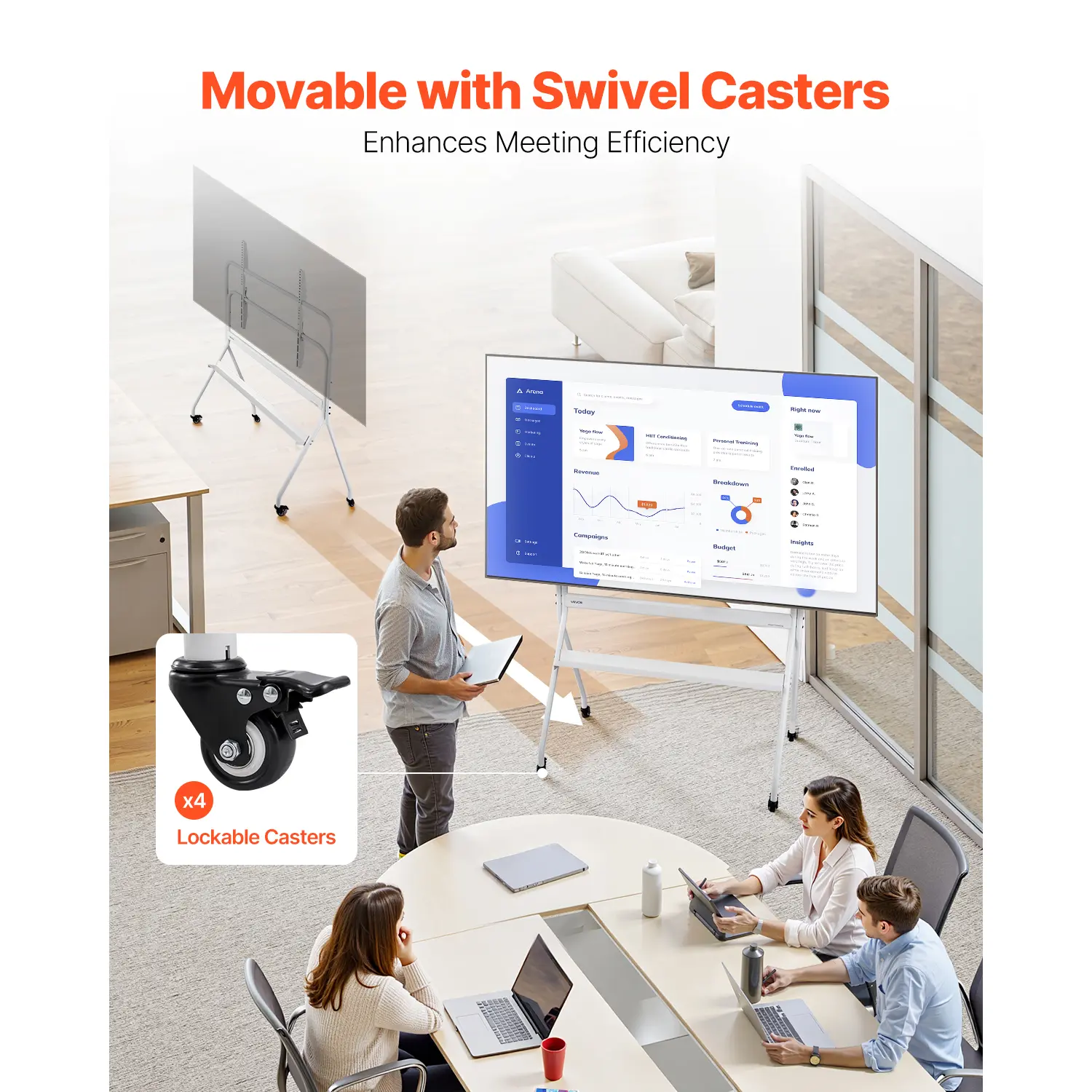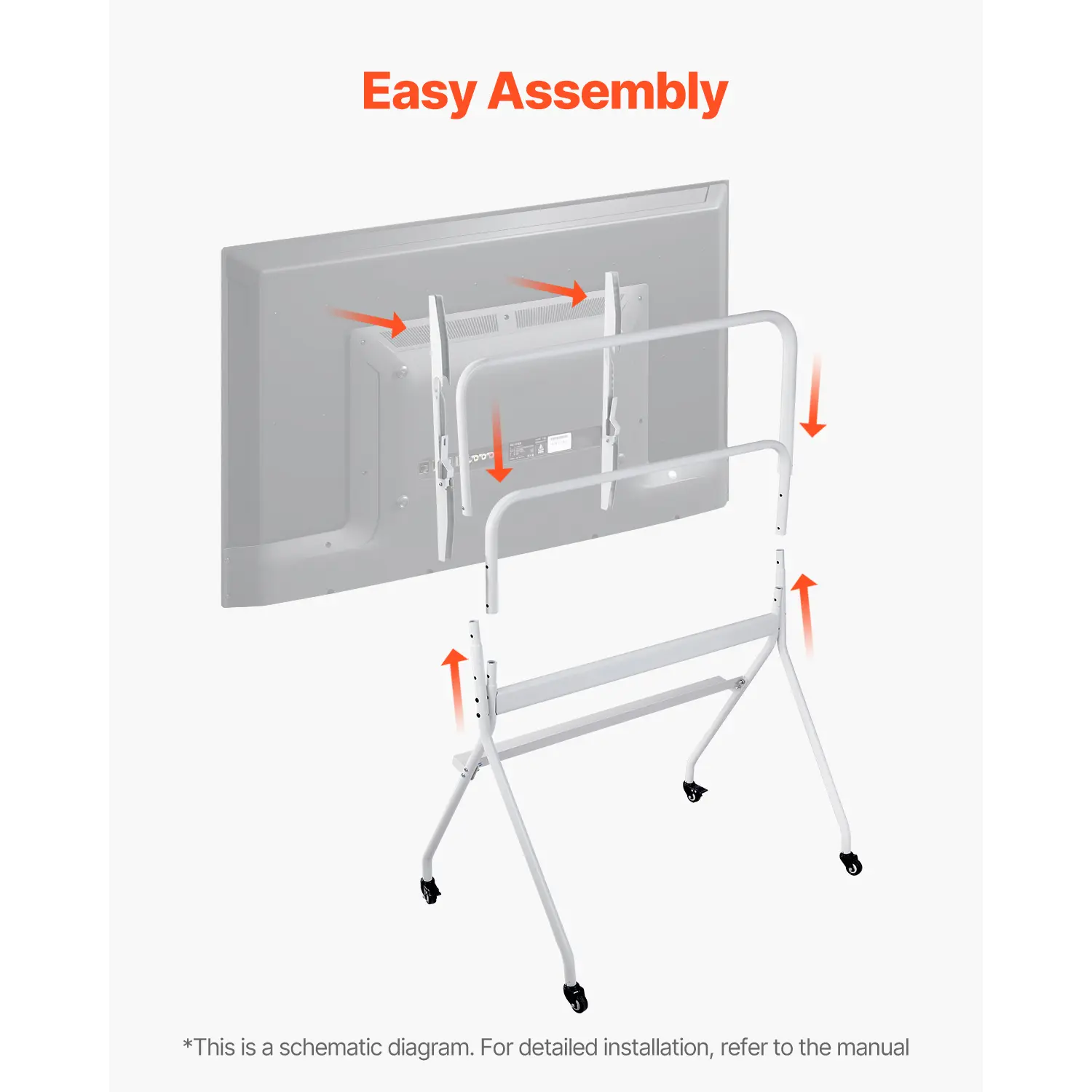 • Convenient Mobility: Equipped with swivel wheels, this mobile TV mount allows you to effortlessly rotate to adjust angles or move it to your desired position. You can easily slide it to different spots in the room.