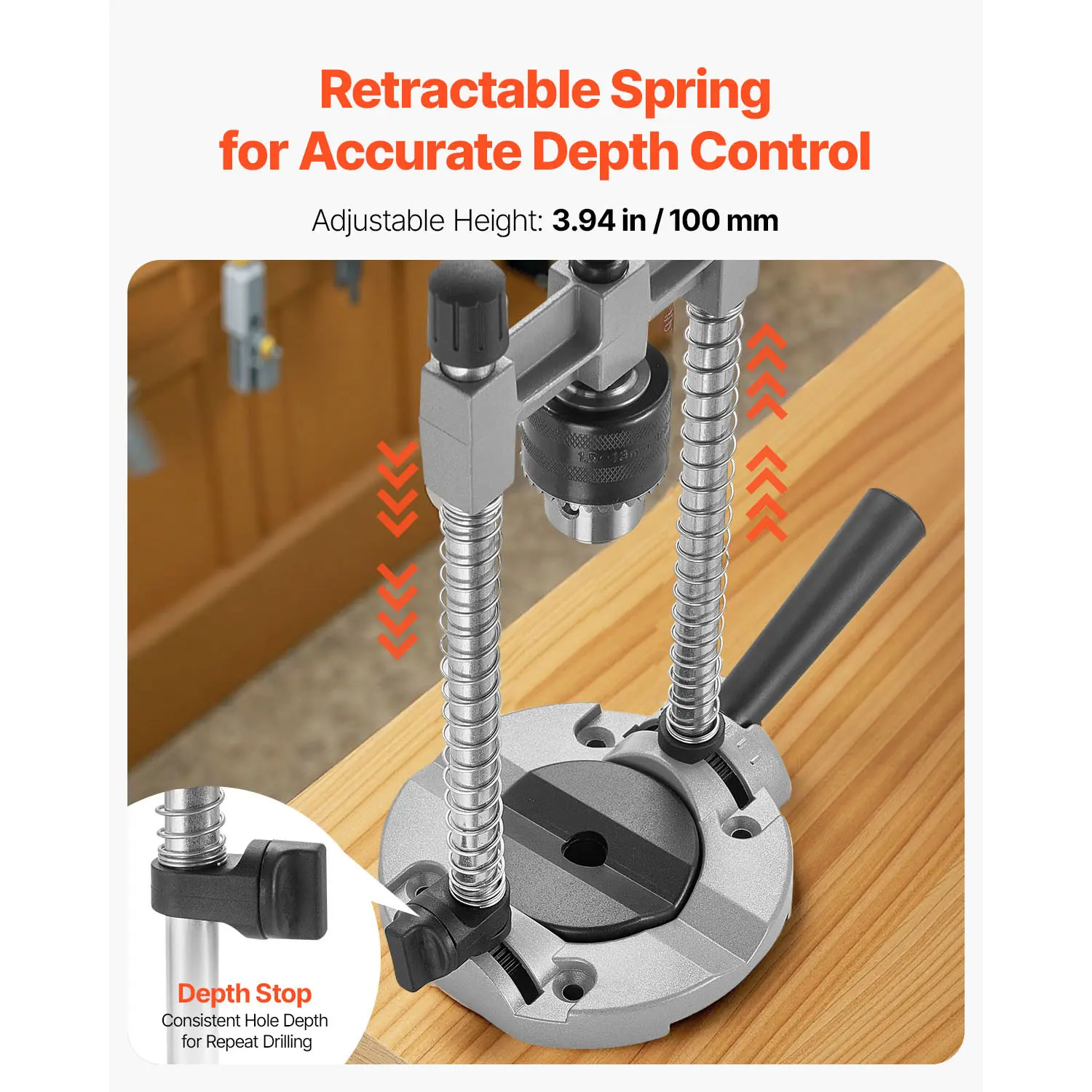 • Precision Drilling: High-strength chuck with a clamping range from 0.06 in to 0.5 in, accommodating various drill bit sizes. Our drill guide features a spring-loaded design for precise depth control, allowing easy 3.94 in height adjustments