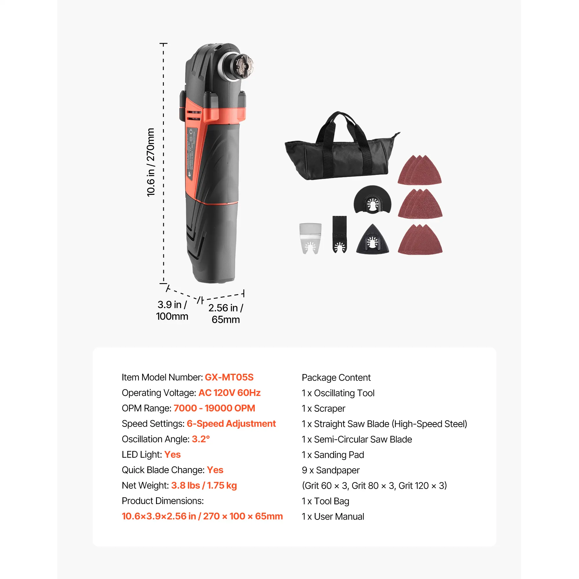 • Multi-functional Tool Kit: VEVOR multitool oscillating tool kit includes a stainless steel scraper, high-speed steel straight saw blade and semi-circular saw blade, a sanding pad, 9 sandpapers (3PCS * 60, 80, and 120 grit). Perfectly ideal for home improvement, woodworking, and DIY projects
