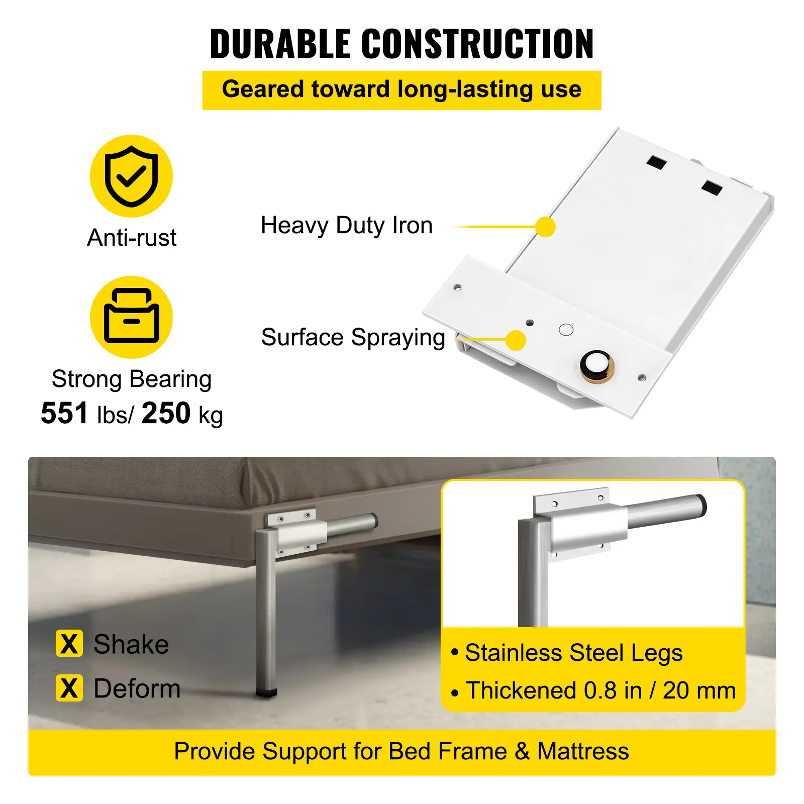 • High-Quality Material: The wall bed mechanical hardware kit is manufactured with high-quality weighted iron + sturdy stainless steel for durability and a high load capacity of 551 lbs/ 250kg. It will not rust or break easily. The bed can be smoothly rolled in and rolled out with a durable copper axis.