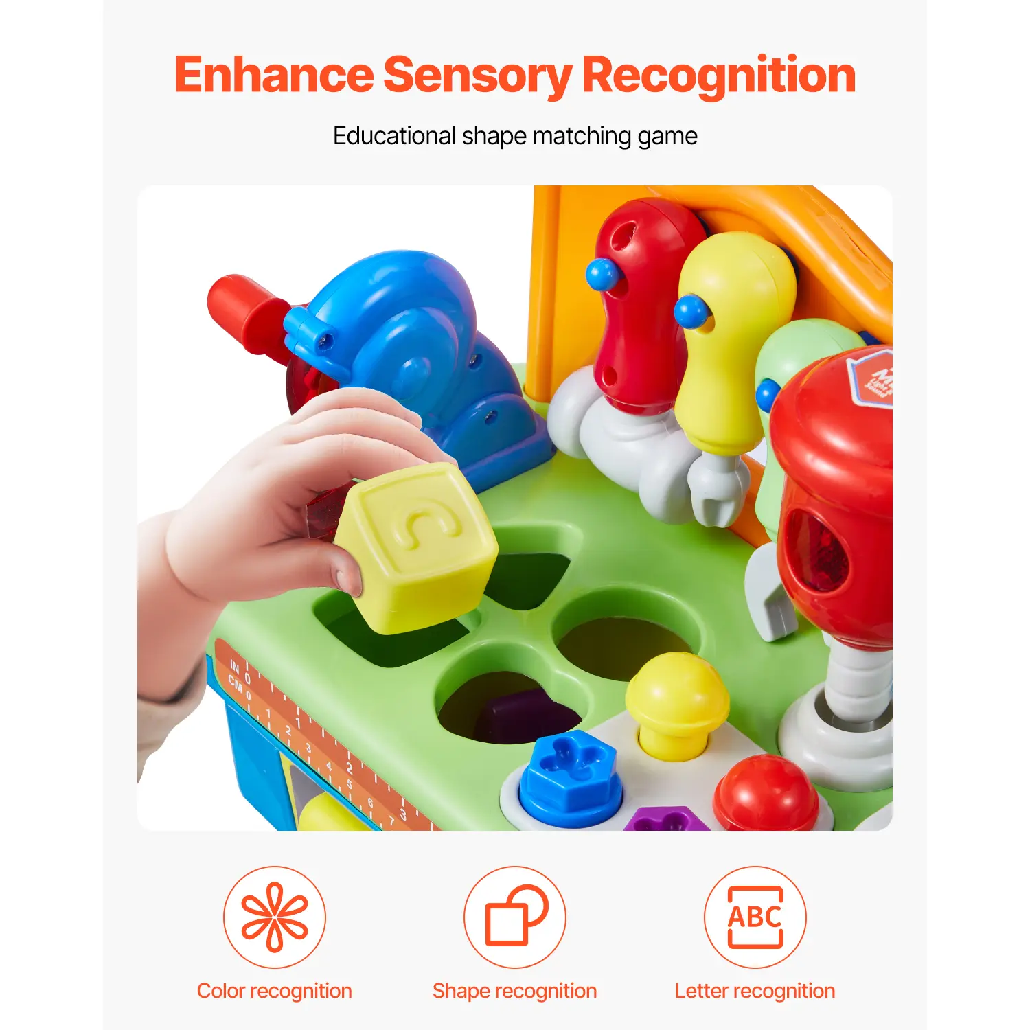 • Hand-eye Coordination: The workbench is designed with different shape slots that encourage kids to match blocks, helping them learn colors, shapes, and letters. Through these fun activities, children improve their hand-eye coordination, cognitive skills, and patience—all while playing and having fun!