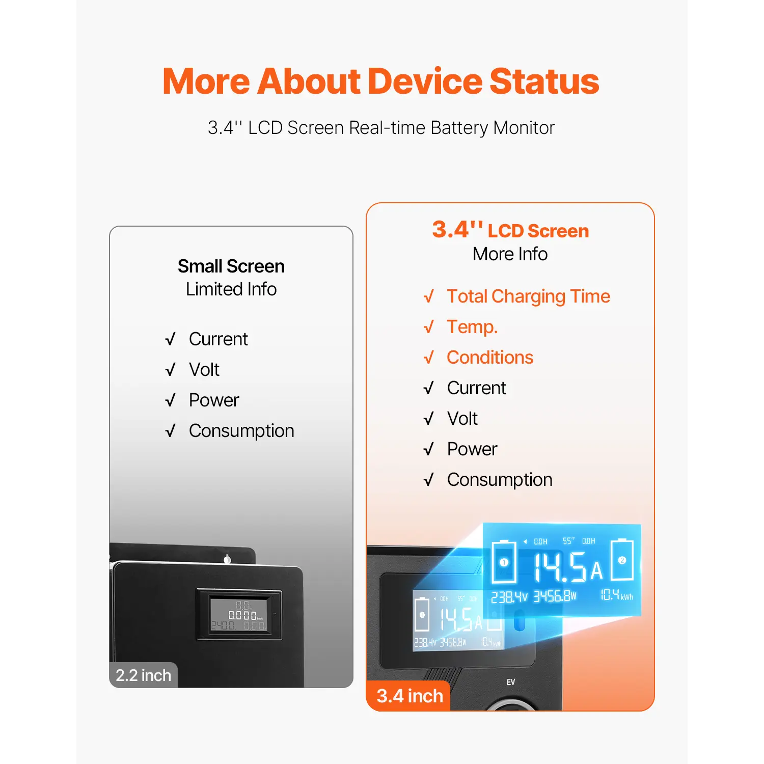 • Overall Info Display: The built-in 3.4'' screen displays not only current, voltage, power, and other basic indexes, but charging time, temperature, and work conditions, providing you with overall information on the charging status.