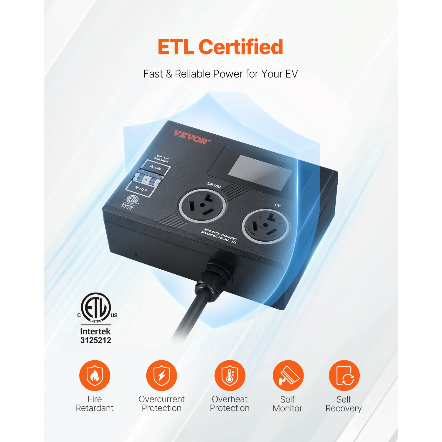 • ETL Certification: The splitter switch is accepted by ETL certificate, indicating the execution of the highest security standards and reliability. The splitter switch is clear from electric risks of overload or short circuit. Note: Before use, set the vehicle's control panel to limit the charging current to below 24A.