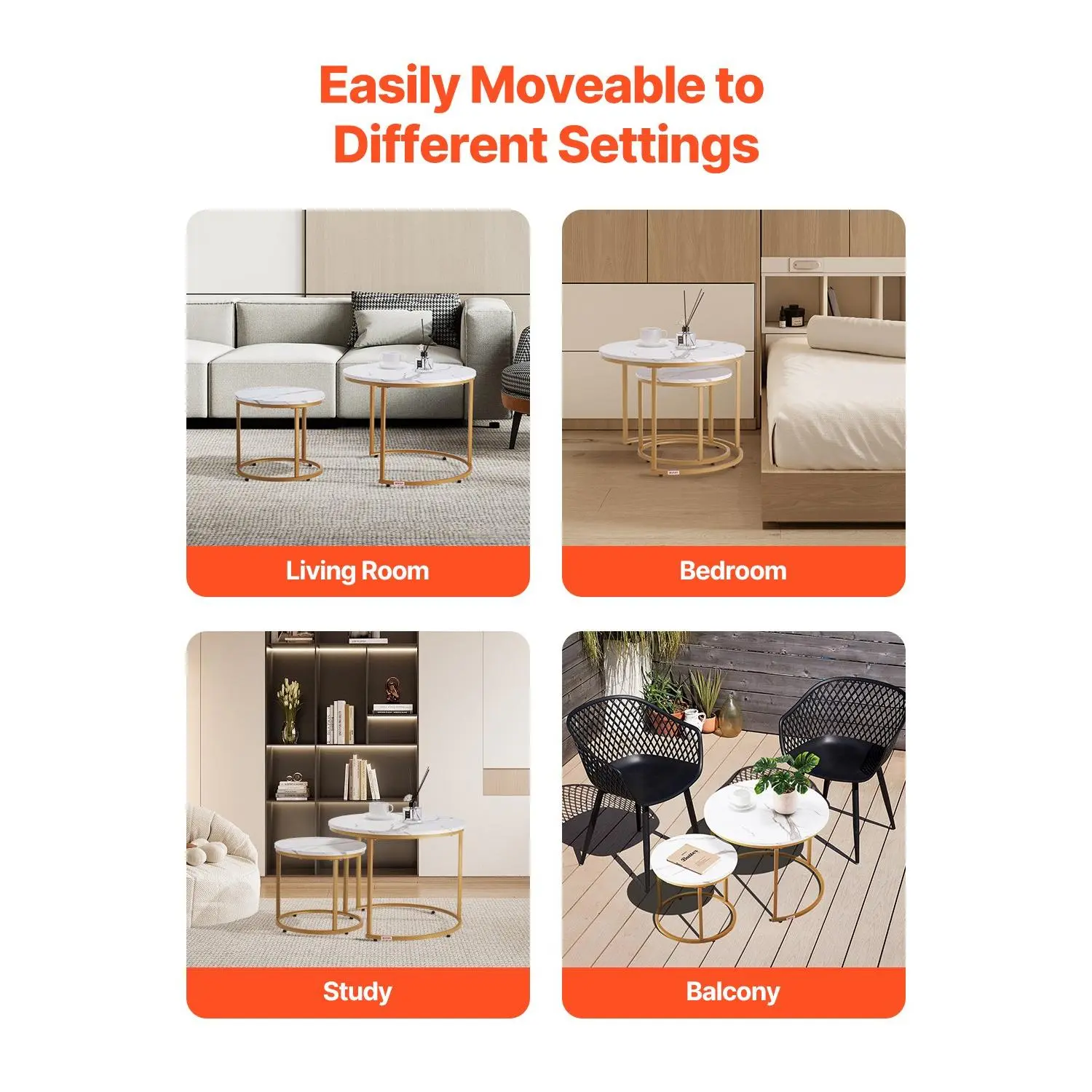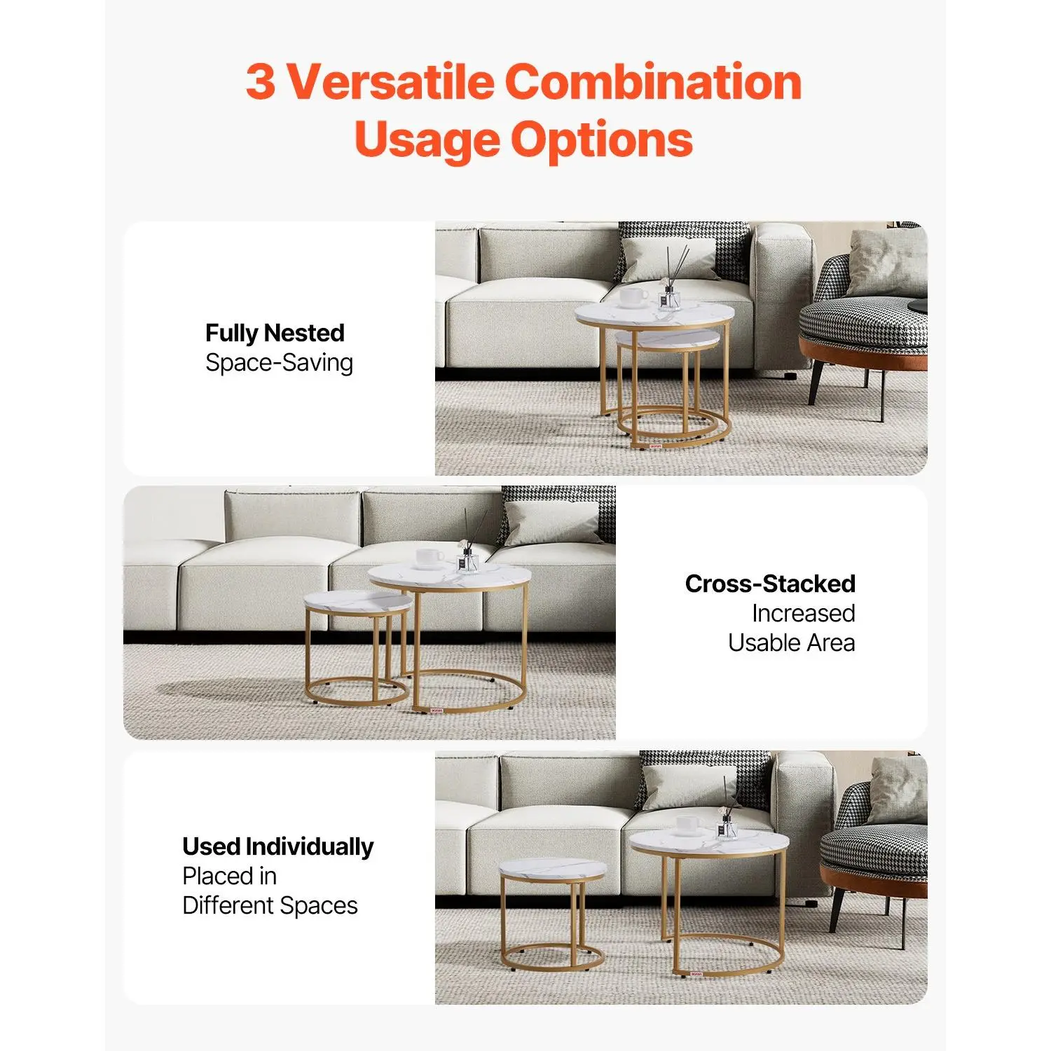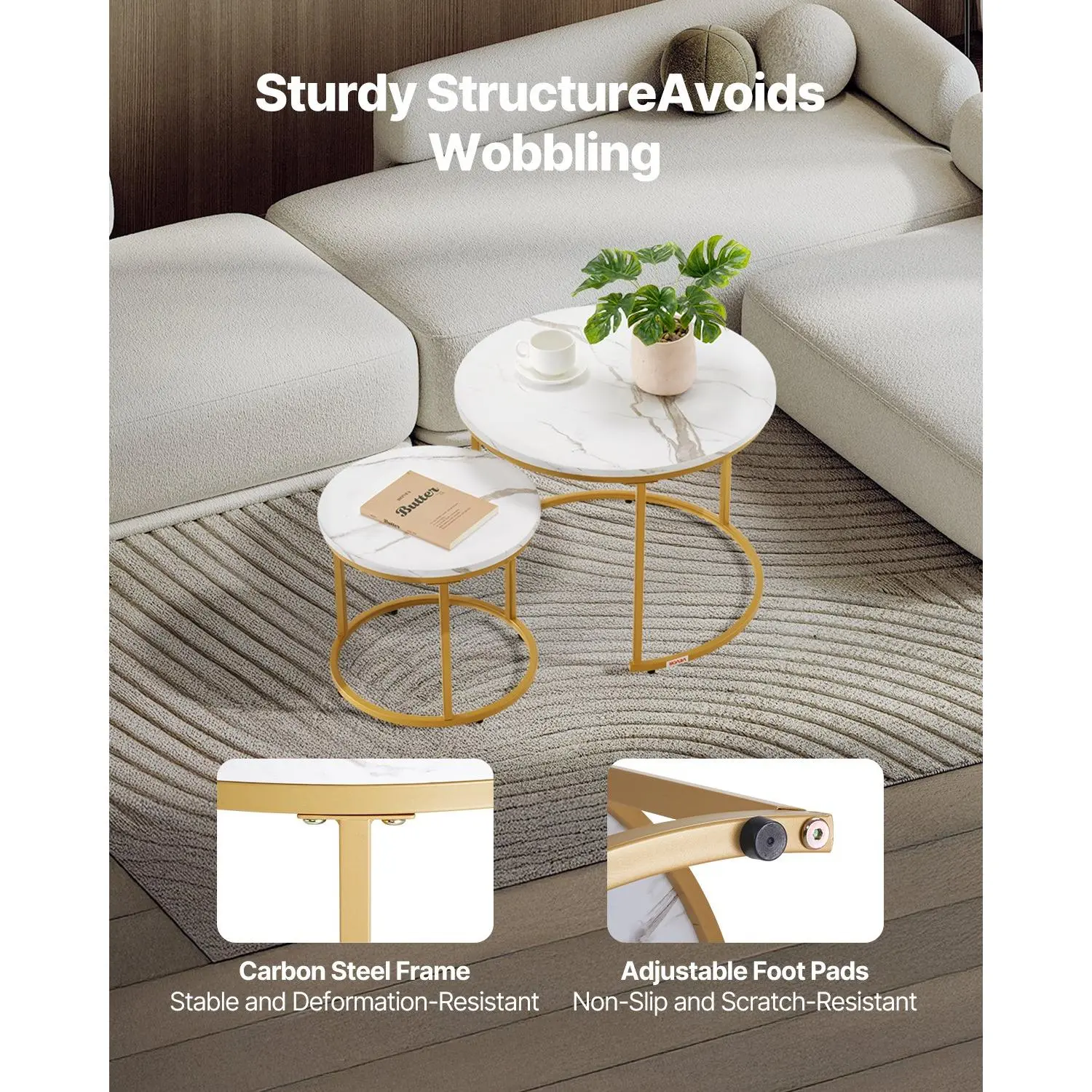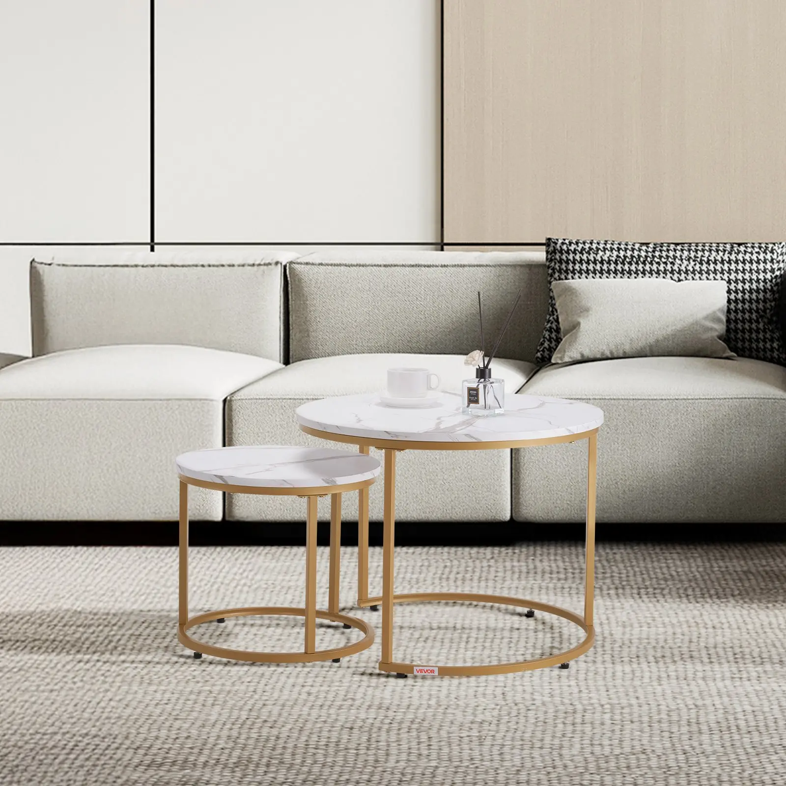 Flexible Combination: This nesting coffee table set includes a large table (φ23.6 x 18.1 in) and a small table (φ15.8 x 14.2 in).The flexible design allows you to mix and match according to personal preference and space requirements.When nested, it saves space in your home.When used independently, it can serve as a coffee table, side table, etc.Stable and Durable: Our round nesting coffee table has a sturdy carbon steel frame, which can withstand everyday pressures and maintain its integrity over time.The adjustable foot pads let you quickly deal with uneven floors, ensuring the table stays stable and wobble-freeSpacious Desktop: The white marble-patterned tabletop of this nesting table is made from high-quality MDF material. It has an elegant design and is scratch-resistant, wear-resistant, and easy to clean, making it ideal for placing various itemsMultifunctional: Our nesting side table has a flexible design, which is ideal for various settings.At home, it can serve as a dining, coffee, or side table, offering extra space.It can be used as a meeting table or temporary workstation in the office.It is also suitable for commercial settings, such as restaurants and cafés, where flexibility can accommodate varying customer flowEasy to Assemble: This nesting end table features a simple and intuitive design, with clear instructions that guide you step by step through the assembly process, allowing for quick setupVEVOR Nesting Coffee Table Set of 2, 23.6 in Round Coffee Table, Nesting Tables for Small Place, Vintage End Side Tables Night Stand with Metal Frame, for Living Room, Bedroom, Office (White & Gold)