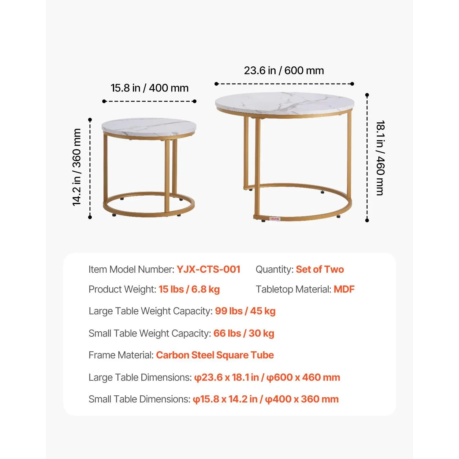 Item Model Number: YJX-CTS-001,Large Table Weight Capacity: 99 lbs / 45 kg,Tabletop Material: MDF,Product Weight: 15 lbs / 6. 8 kg,Quantity: Set of Two,Frame Material: Carbon Steel Square Tube,Large Table Dimensions: φ23. 6 x 18. 1 in / φ600 x 460 mm,Small Table Dimensions: φ15. 8 x 14. 2 in / φ400 x 360 mm,Small Table Weight Capacity: 66 lbs / 30 kg