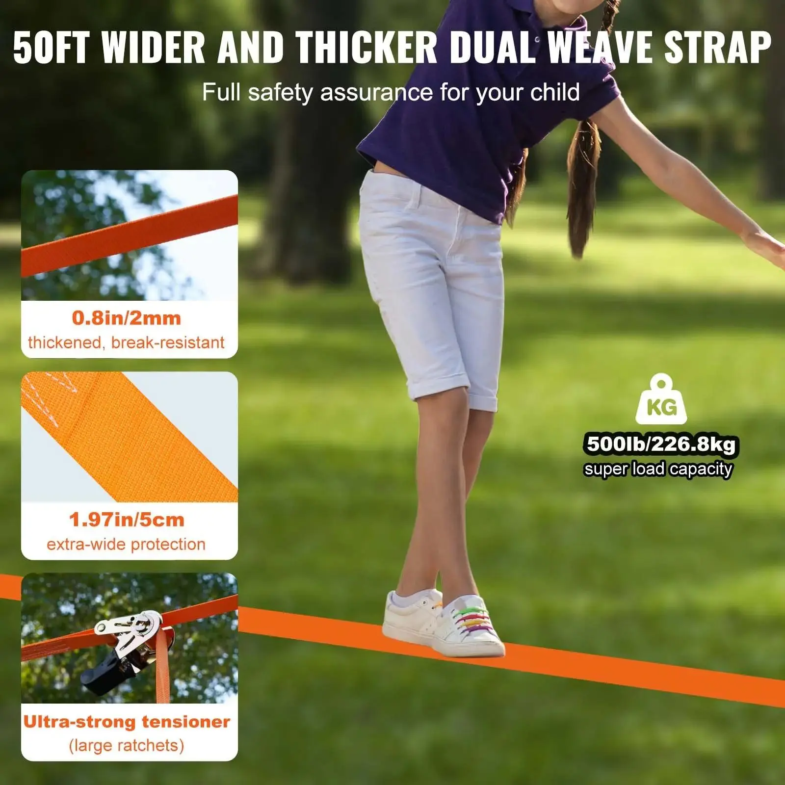 ·Safety Design: Each backyard training equipment set can support up to 500 pounds, sufficient for two or more children to use simultaneously. The upgraded die-cast buckle straps, tensioners, and wider, thicker straps solve the issue of sagging ropes, securely locking onto trees to ensure children's feet don’t touch the ground for a worry-free play experience. The double-layer thermoplastic straps ensure the product doesn’t crack, providing a safe and sufficient gripping experience for children.