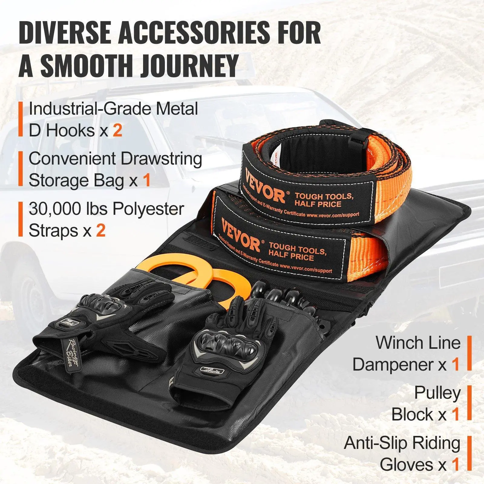 ·Storage Made Simple: Our off road recovery kit comes with a handy and durable storage bag that fits all – two 30,000 lbs polyester straps, two industrial-grade metal D-ring shackles, a pulley, and a pair of gloves. Whether in the trunk or hung on the vehicle, it's always within reach, adapting to your space and needs!