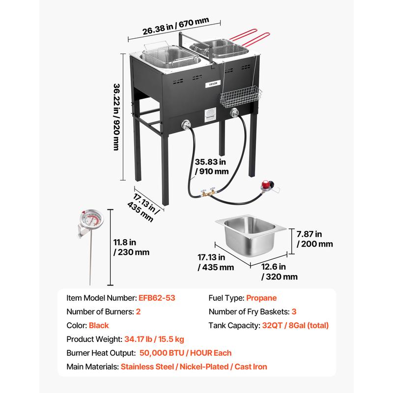 • Large Dual Tanks-8Gal Total: The large-capacity outdoor fryer boasts 32 QT (8 Gal) dual stainless steel tanks (16 QT / 4 Gal each) with clear max oil line – ideal for frying big batches at outdoor gatherings. Cook fries & chicken simultaneously
