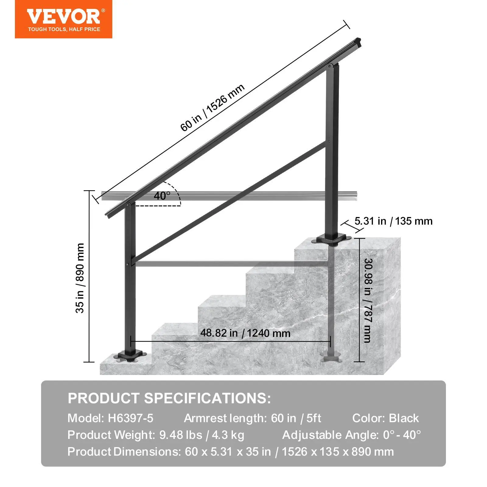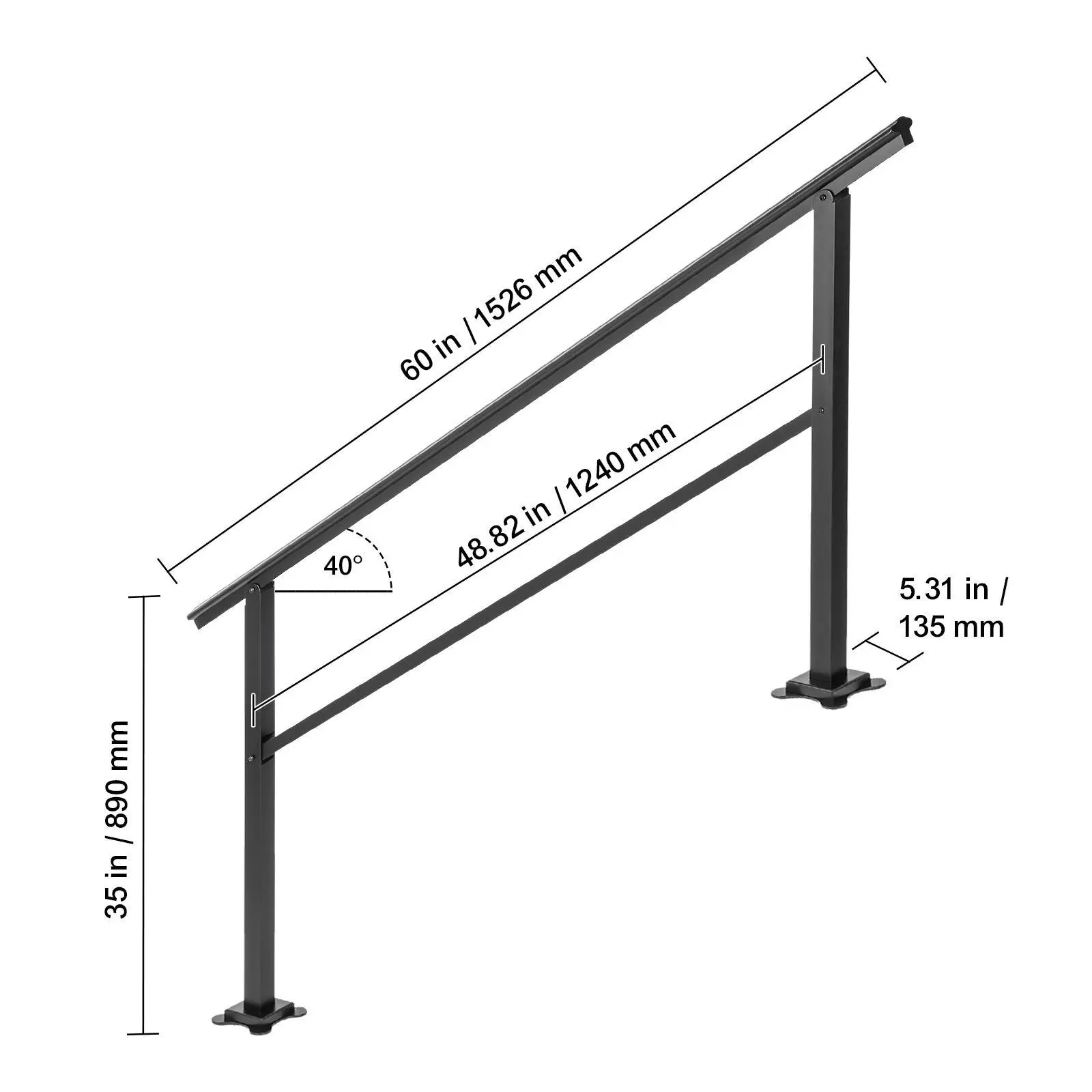 • Adjustable for 4-5 Steps: Product Size (W x H): 59.8" x 35.2"/152 x 89.5 cm; Distance Between Vertical Bars: 48.8"/124 cm. Due to the 0-30° adjustable angle, our handrail for outdoor steps fits your 4 to 5 steps. It is perfect for helping people keep balance when walking up and down the stairs in the rain or winter.